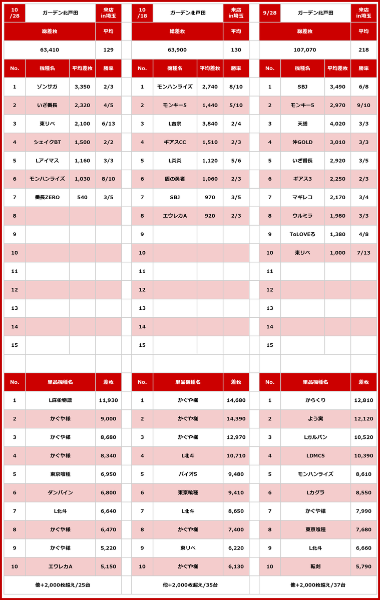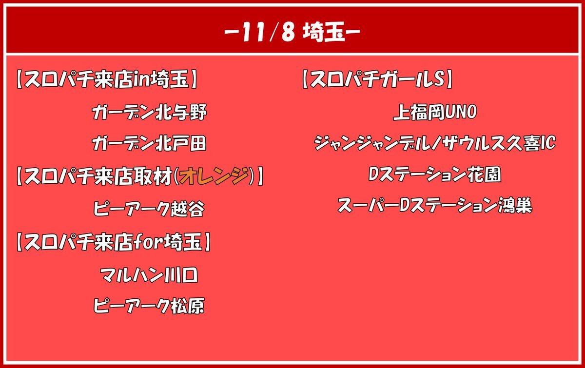 11/8①~⑤(④) 【埼玉】 ✅スロパチ来店in埼玉 ガーデン北与野 8/8 全体Ttl+55,150枚/Av+147枚🔥 ガーデン北戸田 10/28 全体Ttl+63,410枚/Av+129枚🔥 ✅来店取材(オレンジ🟧) ピーアーク越谷 10/18 S)塊Av+1,580枚 P)☆3✨+2.3pt ✅スロパチ来店for埼玉 マルハン川口 9/9