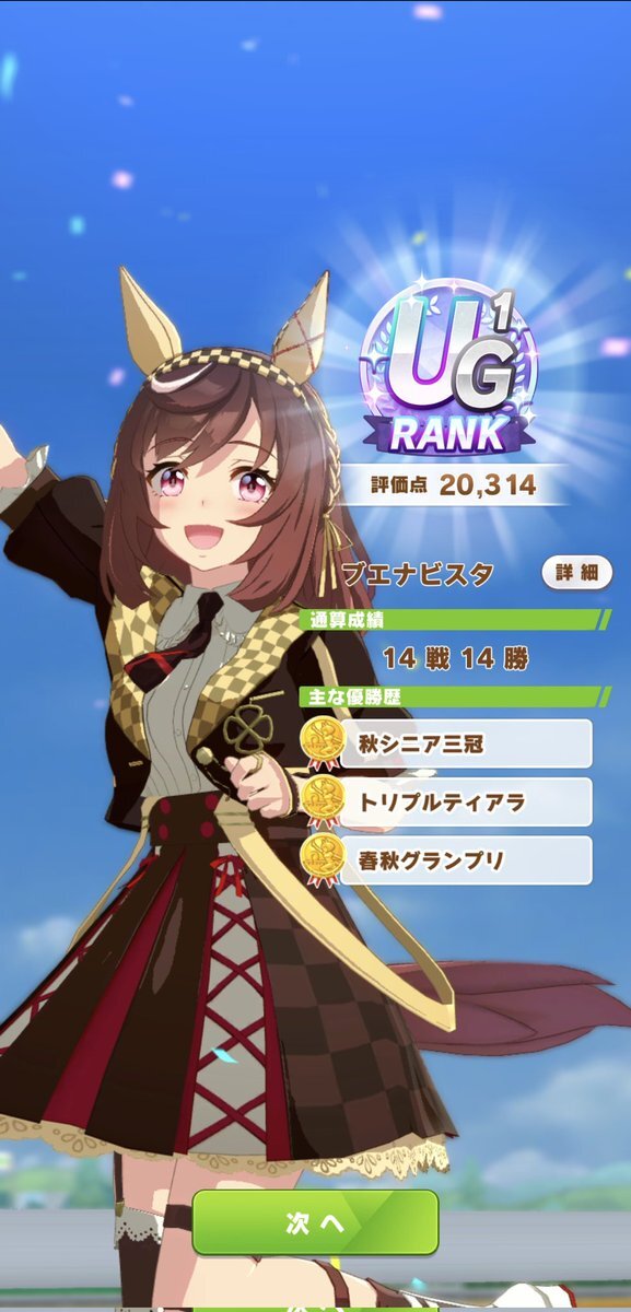 ブエナビスタ育成終了しました、3年ぶりくらいの復帰なんですがこんなにシナリオのボリュームあったっけ?なんかもうギャルゲやってる気持ちになって懐かしくなったよな…てか今までAランクにしか手が届かなかったのにUランクとか見たことないんだけど pic.x.com/qX51UdXu0j