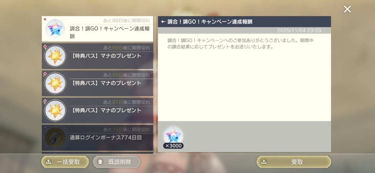 返信先:@koki__0527ちりつもかなり大事ですね~ ただ一つ予想できない嬉しい誤算として、石の消費量に応じて追加されたミッションから3000石ごと?に石配布されるところなんですよね どこまでくれるのか気になってます
