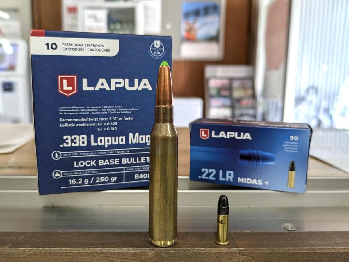同じラプアでも338ラプアマグナムと22ロングライフルではこんなに大きさが違います。価格はマグナムが1発1,310円(銅弾は1,380円)、ミダス+が1発59.3円です。 pic.x.com/ndZkfyvzZ3