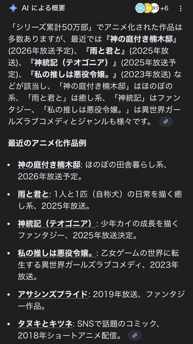 ちなみにアニメ化作品はこんな感じらしい。放送済だとアサシンズプライドとタヌキとキツネだけ見てないな 他にやが君、わたなれ、マイノグーラ、夢中さきみにと名作アニメでもアニメ化発表時50万部のシリーズは結構多かった(巻数は置いとくとして……) pic.x.com/zTKeTzyIka