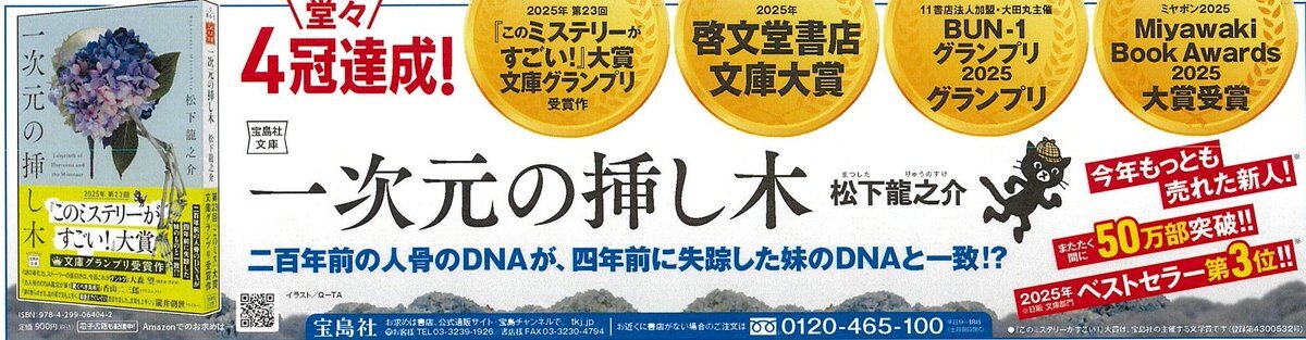 『一次元の挿し木』が4冠達成、年間売上3位、50万部突破とのことで、本日の読売新聞に広告いただいております、、! 改めて、読者の方、書店員の方、出版に関わってくださったすべての皆様に、感謝申し上げます。誠にありがとうございました。 #一次元の挿し木 #このミス pic.x.com/1WxUJXDizY