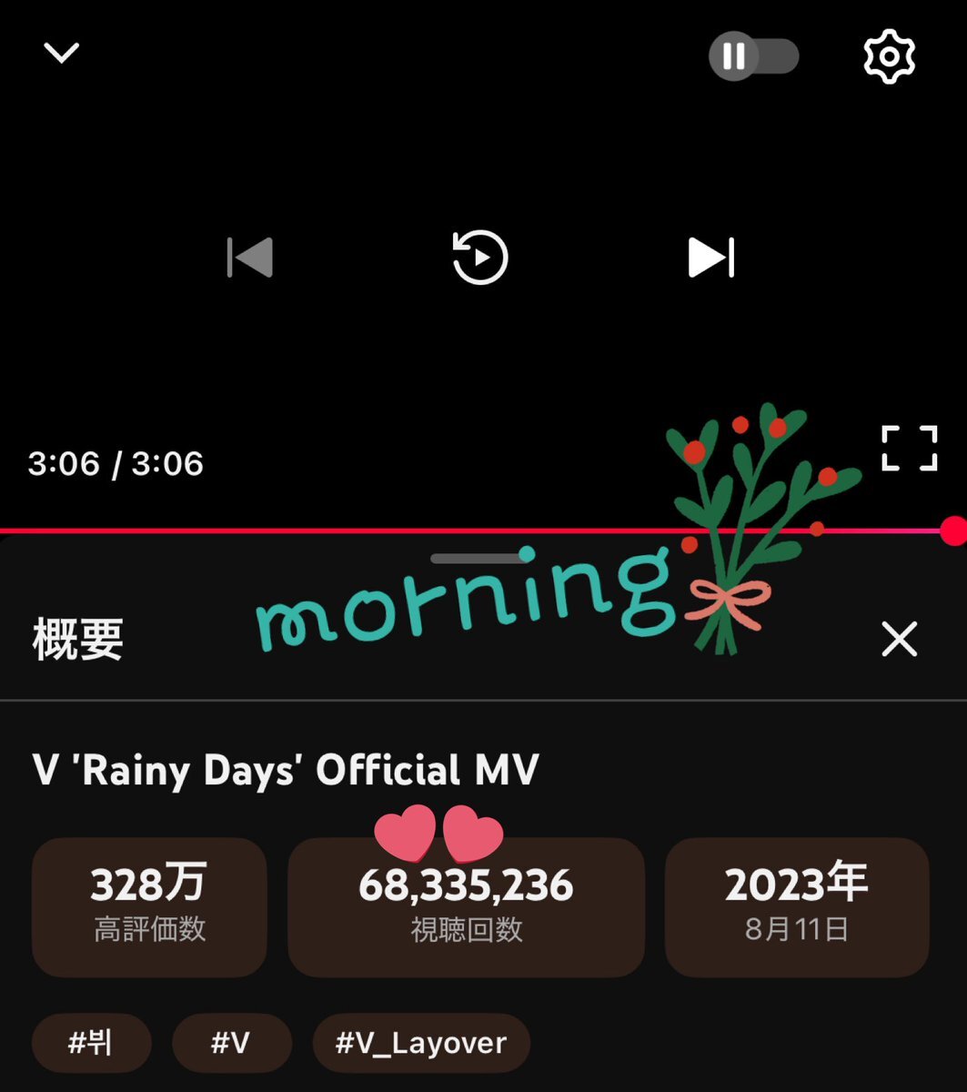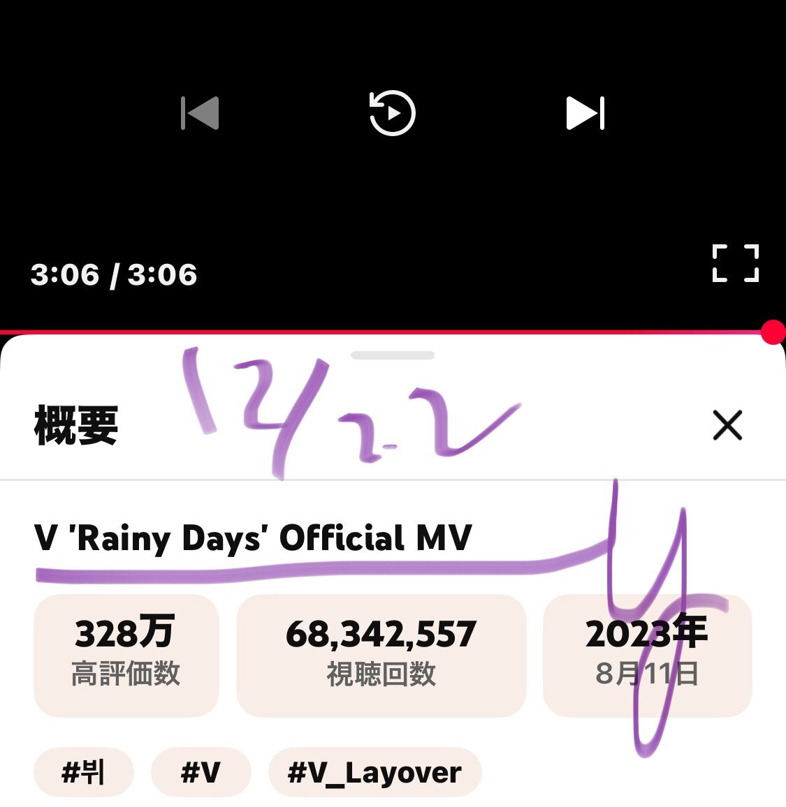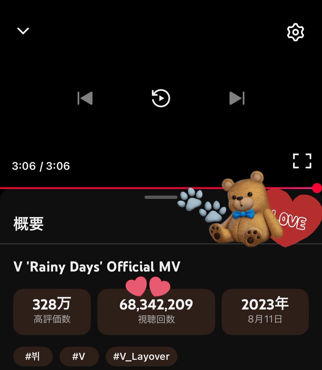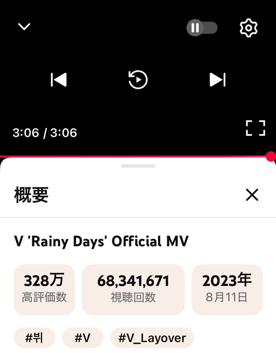 返信先:@taestation_jp☔ RD MV 7000万回再生へ🐾 テヒョンさんの「Rainy Days」MVが7000万回再生まであと少しです! 1日も早い達成を目指しましょう✨ youtu.be/yTsINmrAK4I?si… #V_RainyDays pic.x.com/T610FUcDKM