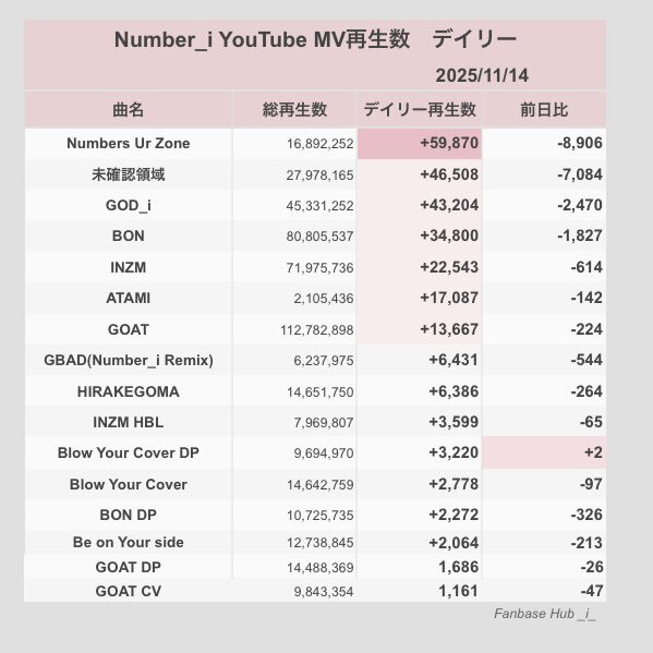𓂃 𖧷𓏸 MVデイリー再生数 𓏸𖧷 𓂃 𓈒𓏸 2025/11/14 𓏸𓈒 🧹 Numbers Ur Zone 59,870 (−8,906) 🛸 未確認領域 46,508 (−7,084) 🙏 GOD_i 43,204 (−2,470) ▶︎ NUrZ youtu.be/-FGFbUfosl8 ▶︎ 全曲データはこちら fanbase-hub.com/mv-daily/ #YouTube_Number_i x.com/fanbasehub_i_/…