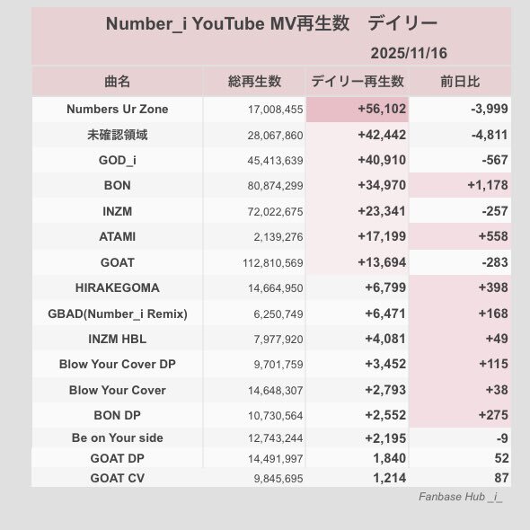 𓂃 𖧷𓏸 MVデイリー再生数 𓏸𖧷 𓂃 𓈒𓏸 2025/11/16 𓏸𓈒 🧹 Numbers Ur Zone 56,102 (−3,999) 🛸 未確認領域 42,442 (−4,811) 🙏 GOD_i 40,910 (−567) ▶︎ NUrZ youtu.be/-FGFbUfosl8 ▶︎ 全曲データはこちら fanbase-hub.com/mv-daily/ #YouTube_Number_i pic.x.com/098Yw9Zz1s x.com/fanbasehub_i_/…
