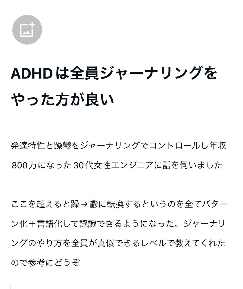 ADHDはジャーナリングやった方がいいって結構言ってるけど、明日の記事は 日記にジャーナリングの要素を組み合わせて感情や出来事を書き出し、躁鬱や発達特性をしっかりコントロールされて年収800を稼ぐエンジニアの女性です! マジで自己分析と発達特性コントロールが参考になった…明日出ます