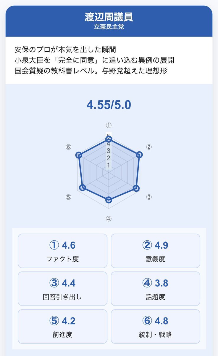 Grokで採点してみた!渡辺周議員(立憲民主党)@ 251118衆安保委 4.55 小泉大臣を「完全に同意」に追い込む展開 国会質疑の教科書レベル。与野党超えた安保議論の理想形 クマ→台湾→洋資源と繋ぎ、大臣から「武器携行は将来排除しない」「3文書改定で強化」引き出す #国会評価フレーム ALTに詳細 pic.x.com/fbeAgCW9WU
