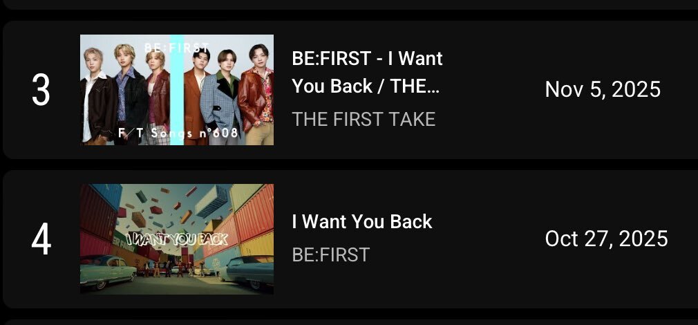 3⇔4 入れ替わりましたね! BE:FIRST / I Want You Back #3 THE FIRST TAKE youtu.be/f-xPNjZXrcA?si… #4 MUSIC VIDEO youtu.be/3Oyy8JnYMyA?si… pic.x.com/wjMATNUCS7