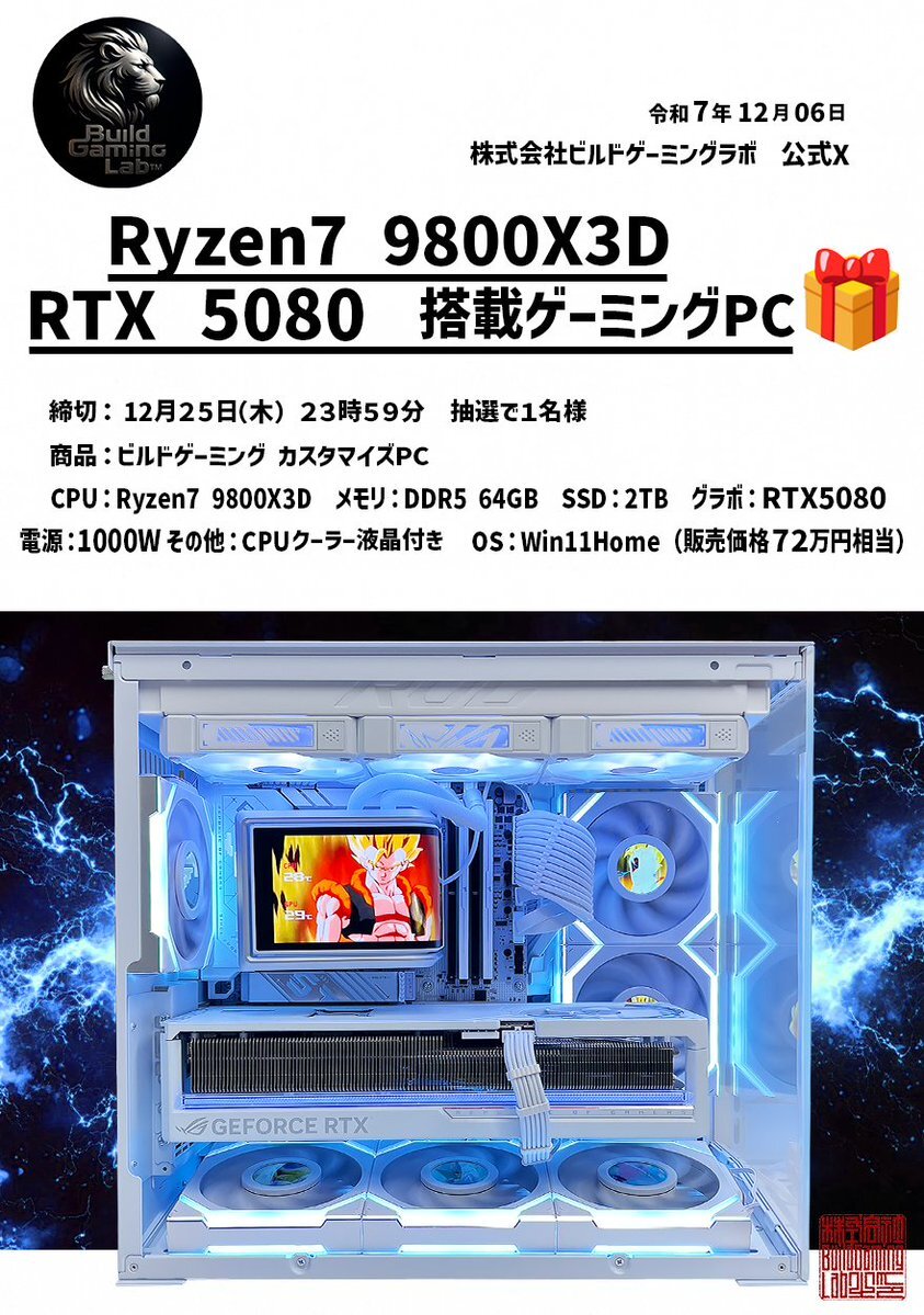 / 冬の特大プレゼント第一弾🎅 🎁総額70万円の特別モデルを1名様に Ryzen7 9800X3D × RTX5080🔥 \ @BuildGamingLabをフォロー ②この投稿をリポスト ③『#今年一番プレイしたゲームタイトル』をつけて引用リポストで当選率x2⤴️