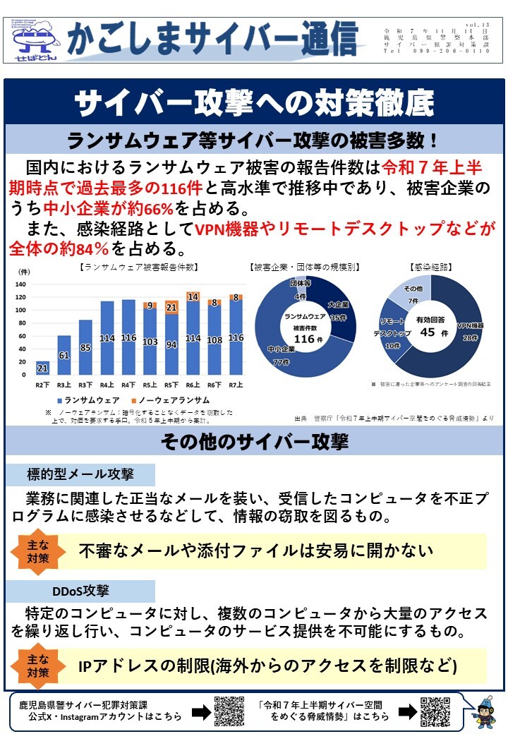 「サイバー攻撃への対策について」を発出します。 ランサムウェアや標的型メール攻撃などのサイバー攻撃への対策を行いましょう。 #ランサムウェア #VPN #リモートデスクトップ #サイバー攻撃 #標的型メール攻撃 #DDoS攻撃 #サイバーセキュリティは全員参加 pic.x.com/j40DzxPbM3