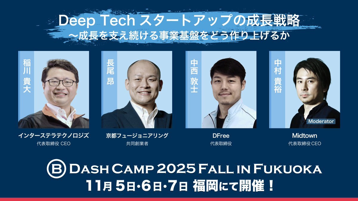 2025年11月5日〜7日@福岡開催! B Dash Camp 2025 Fall in Fukuokaセッション紹介 「Deep Techスタートアップの成長戦略 〜成長を支え続ける事業基盤をどう作り上げるか」 スピーカー: 稲川 貴大(インターステラテクノロジズ) 長尾 昂(京都フュージョニアリング) 中西 敦士(DFreepic.x.com/ysN62i0tIg
