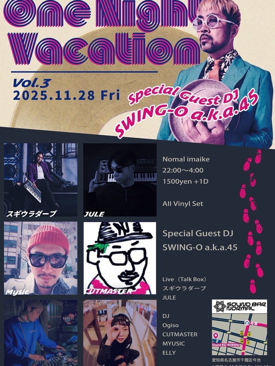 【#11月】 11.28.Fri 〓One Night Vacation vol.3〓 @NORMAL_IMAIKE 今池 OPEN 22:00 / CLOSE 4:00 ▪︎Special Guest DJ SWING-O a.k.a 45 ▪︎Live [Talk Box] スギウラダーブ JULE ▪︎DJ Ogiso CUTMASTER MYUSIC ELLY ▷info instagram.com/p/DQ_1odxAQZW/… #愛知 pic.x.com/HDM1iFMQTv