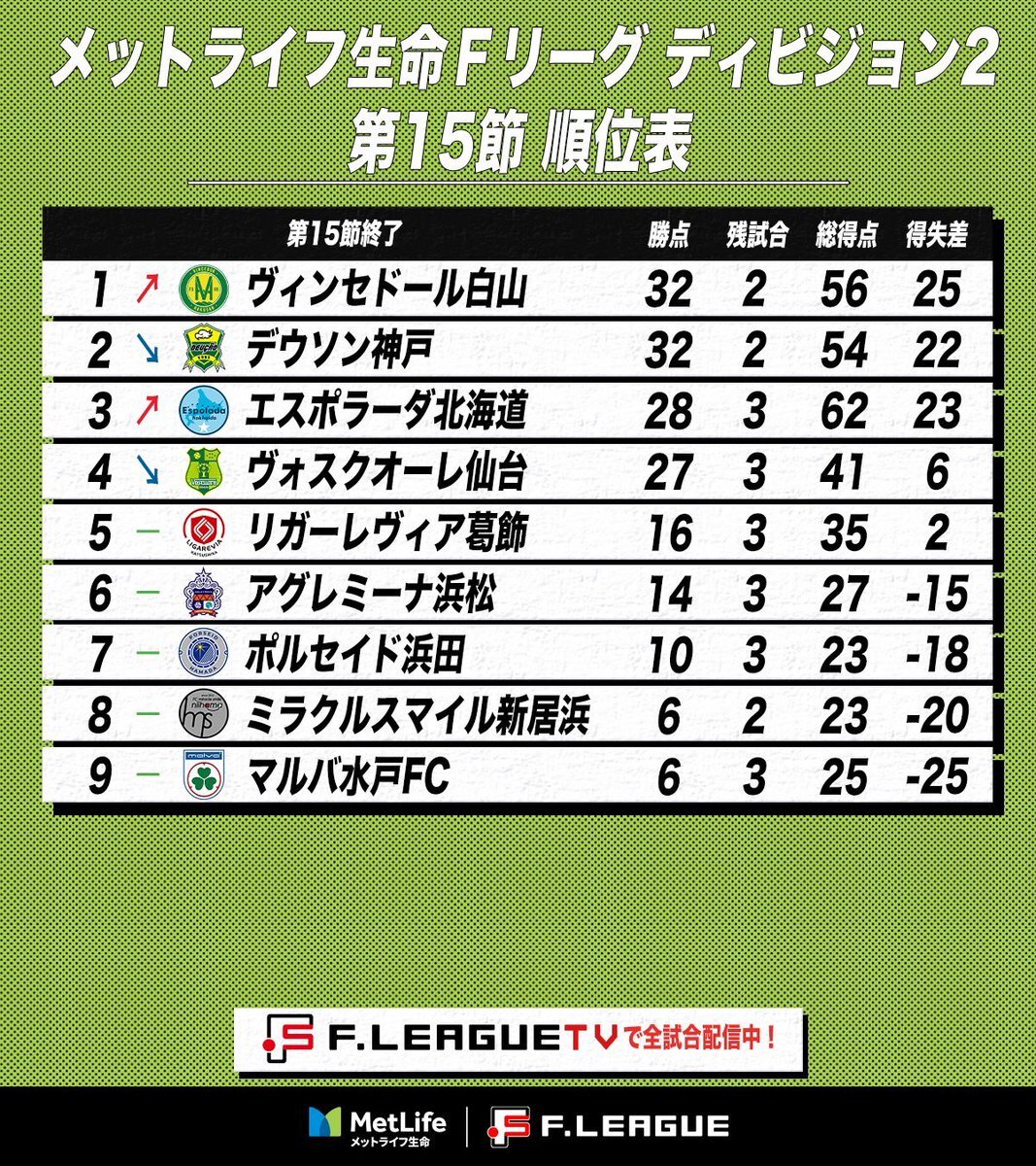 ✨#メットライフ生命Fリーグ 2025-26 ディビジョン2✨ // #ヴィンセドール白山 が暫定首位に浮上⤴️ F2優勝&F1昇格争いは“四つ巴”の大混戦💥 \\ ✅最新順位表 🏆#メットライフ生命Fリーグ ディビジョン2 📍第15節終了 1位 #ヴィンセドール白山 2位 #デウソン神戸 3位 #エスポラーダ北海道 4位 pic.x.com/ABj8ksUY26