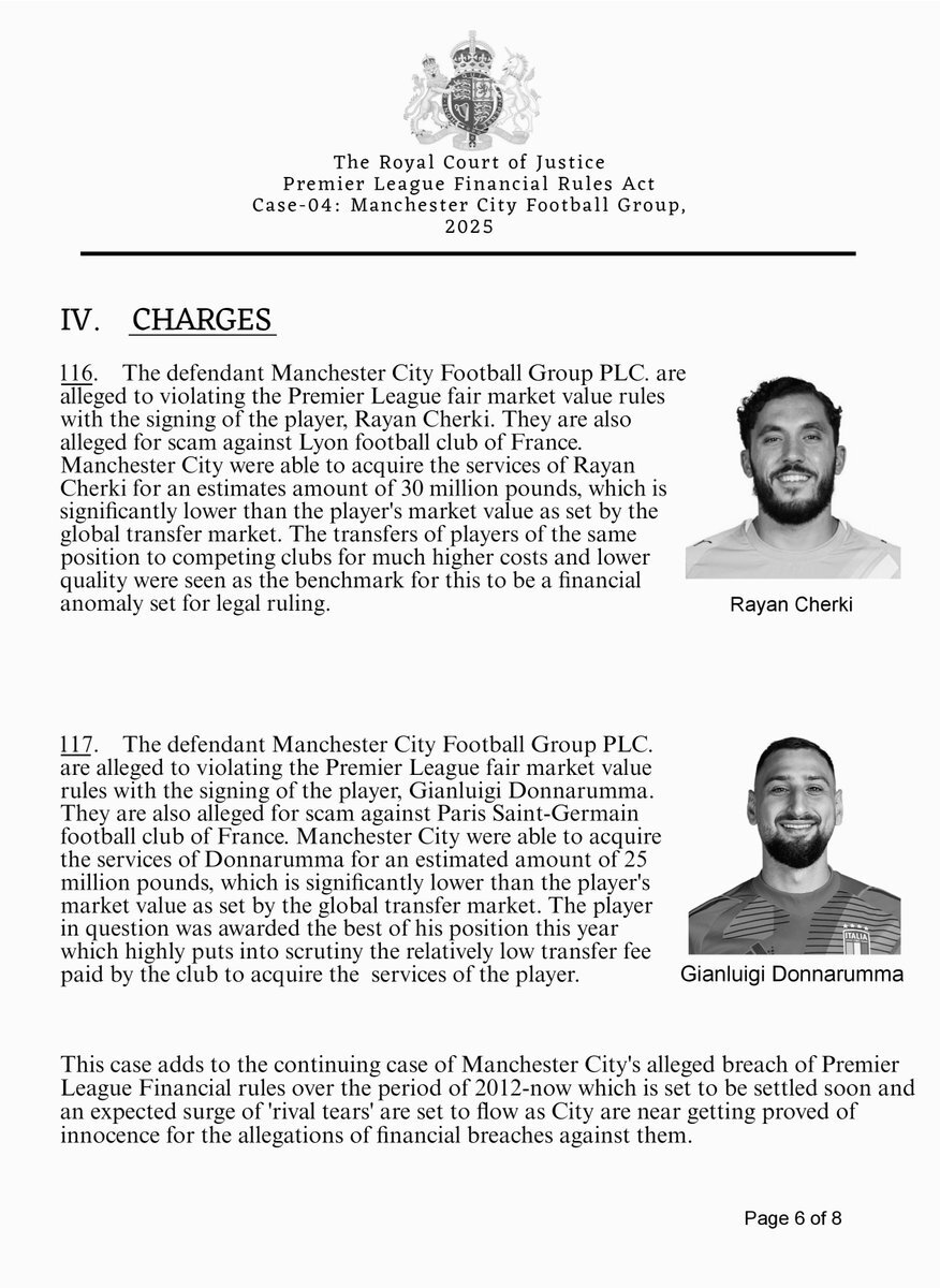 🚨𝐁𝐑𝐄𝐀𝐊𝐈𝐍𝐆: Manchester City are faced with two more charges of alleged breach of Premier League FFP rules, now 117, over the transfers of Rayan Cherki and Gianluigi Donnarumma, the services of whom they acquired significantly under market value. Legal document attached.