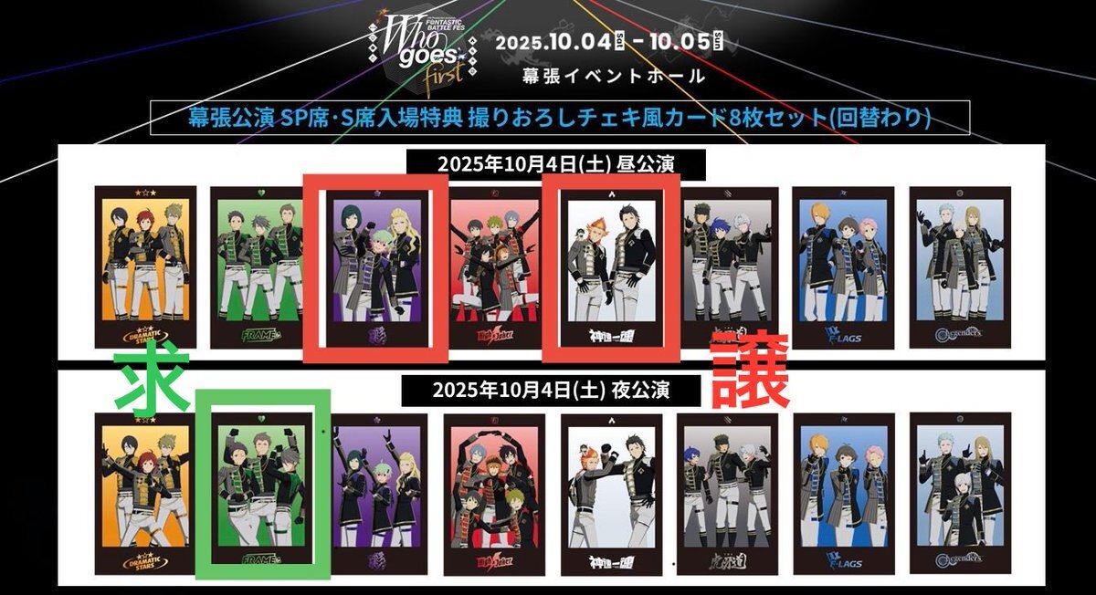 【交換】SideM バトルフェス ファンフェス 入場特典 チェキ風カード 【譲】 幕張 10/4(土)昼公演 🟥枠 彩 神速一魂 【求】 幕張 10/4(土) 夜公演 🟩枠 FRAME 郵送希望。 検索からもお気軽にお声掛けください。 pic.x.com/pDD6NRDGgq