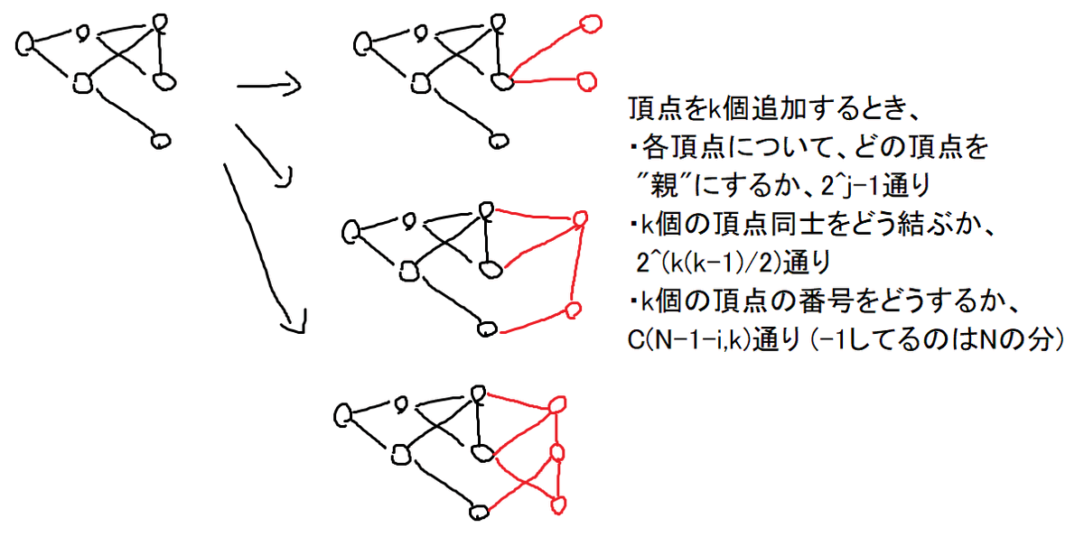 アライグマ「G問題は DP[i][j]=i頂点の連結グラフで、頂点1から一番遠い点がj種類あるようなグラフの個数 としてDPすればいいのだ! 遷移は、「1遠い頂点」をまとめて追加するのだ!」 pic.x.com/dffhZIjH6N
