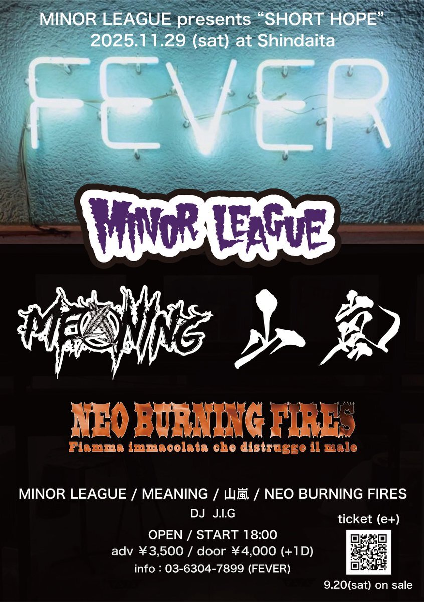 【11.29(Sat)】 MINOR LEAGUE presents "SHORT HOPE" MINOR LEAGUE 山嵐 MEANING NEO BURNING FIRES <<DJ>> J.I.G OPEN / START 18:00 e+にてチケット発売中!! eplus.jp/sf/detail/4405… ご来場お待ちしております!! fever-popo.com/schedule/2025/… pic.x.com/GDTRvv22Vi