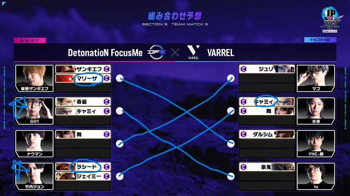 個人的予想。 餅選手のダルシムがキツイため板ザン選手はリザーブか? やや苦しんでいるが、GO1選手かジョン選手が大将予想。それをts選手とマゴ選手が迎え撃つと予想。 海外遠征組が少ないチーム同士。最終戦にふさわしい! #SFリーグ #スト6 pic.x.com/t7ndgHdHhM