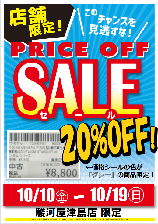 🌟10/10~10/19まで🌟 突然ですが、#セール やっちゃいます👍 店内のグレープライス商品を2⃣0⃣%OFF 😆 きっと見つかる、お宝が。。。🪙 #このチャンスを見逃すな‼️🉐 😎 今すぐ、#駿河屋津島店 へGO 👉👉👉👉 ※1)対象はグレーの値札 ※2)ゲームハード、トレカは対象外 pic.x.com/285rbFlY9h