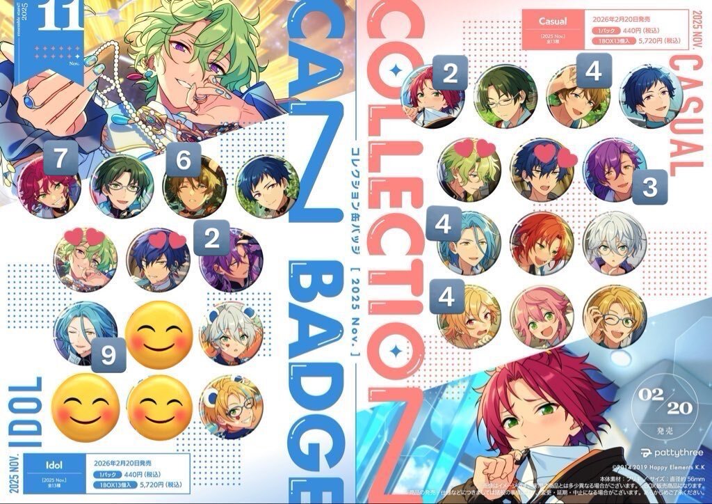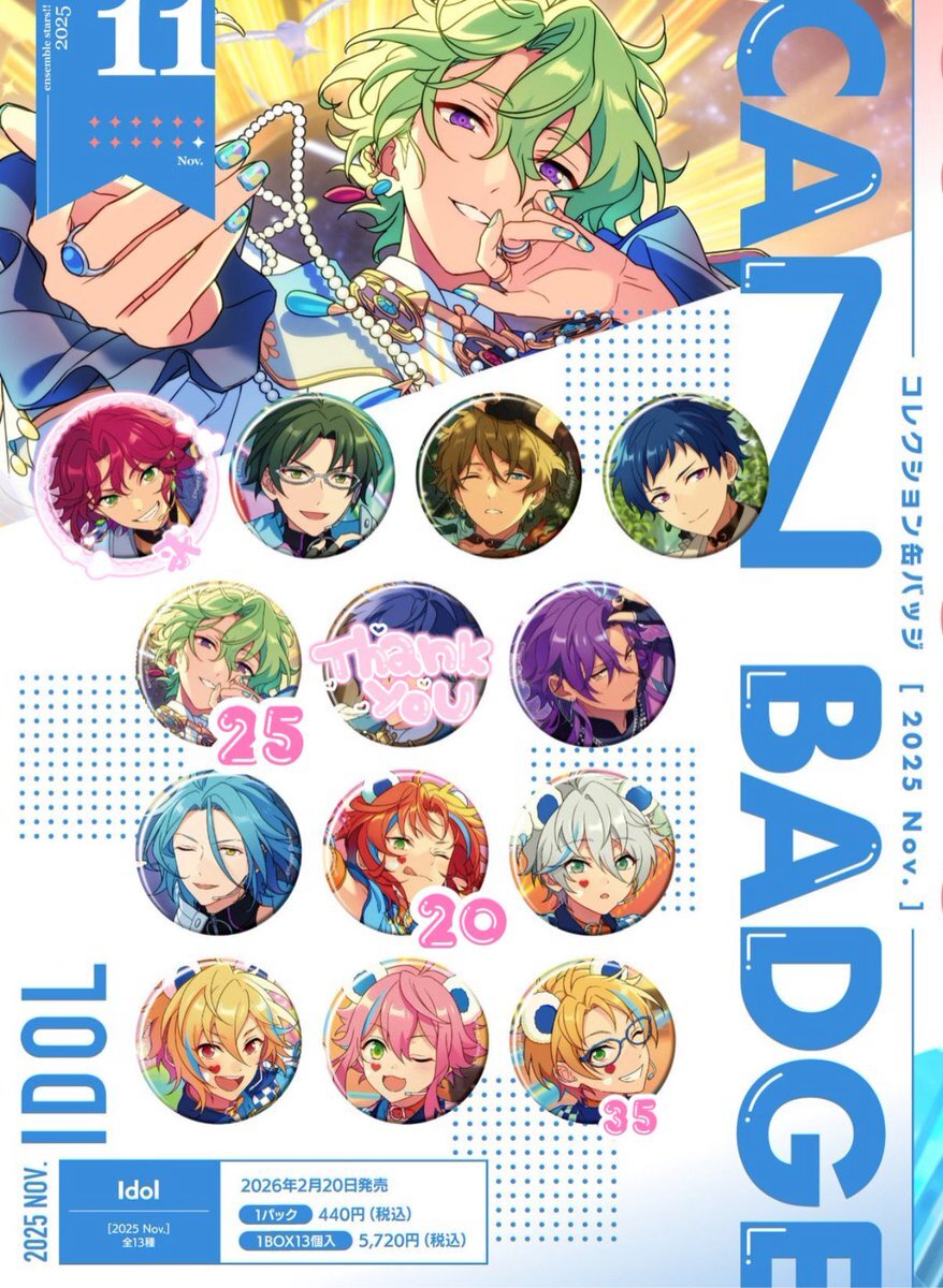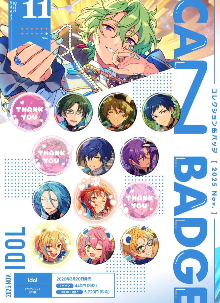 【交換 買取】あんスタ コレクション缶バッジ 2025 Nov. idol 求:日和 or 定価+送料 譲:〇敬人 翠 〇弓弦 ジュン アドニス 〇HiMERU レオ 〇カンナ なずな 〇桃李 真 5BOX予約予定 郵送のみ ☆5↔☆5のみ ☆4比率違い可能(1:2〜) 〇の譲渡可能 検索からお気軽にお声掛けください。 pic.x.com/sLj3Nm95QW
