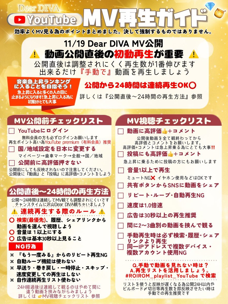 #ROIROM応援ガイド Dear DIVA MV公開に向けてYouTube再生ガイドを作成しました YouTubeは急上昇チャートに入ると一気に多くの人に見て貰えます 初動が特に大事で公開時に多くの人が再生することが重要になってきます ⸜⸜ 急上昇入ること ⸝⸝ をひとまずの目標しましょう
