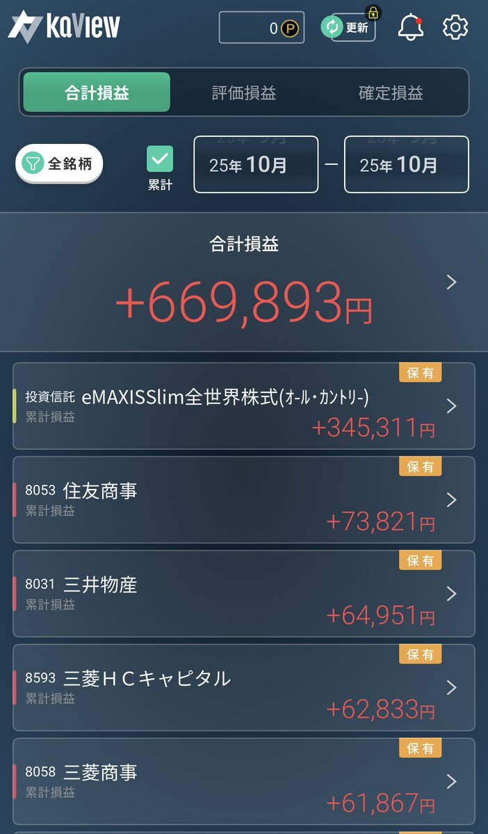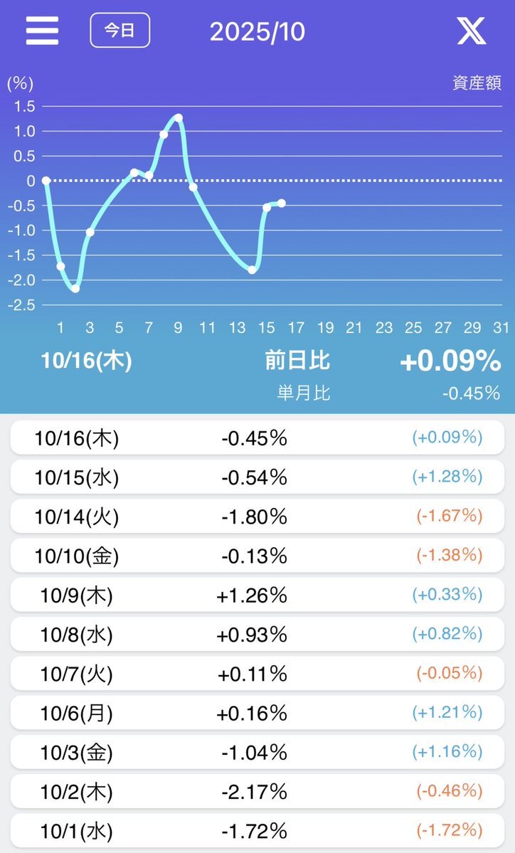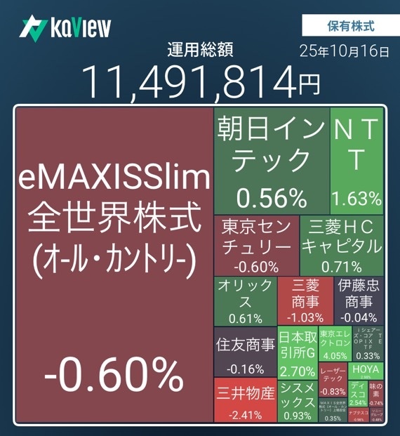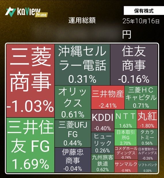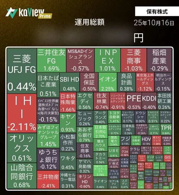 10/16のポートフォリオです iHI、卸売、保険などが弱く銀行、イオン、INPEX、JPX、関電などが頑張りました 明日も楽しみです 紹介コード【CDpw】 #カビュウ pic.x.com/ul08fVKdVc