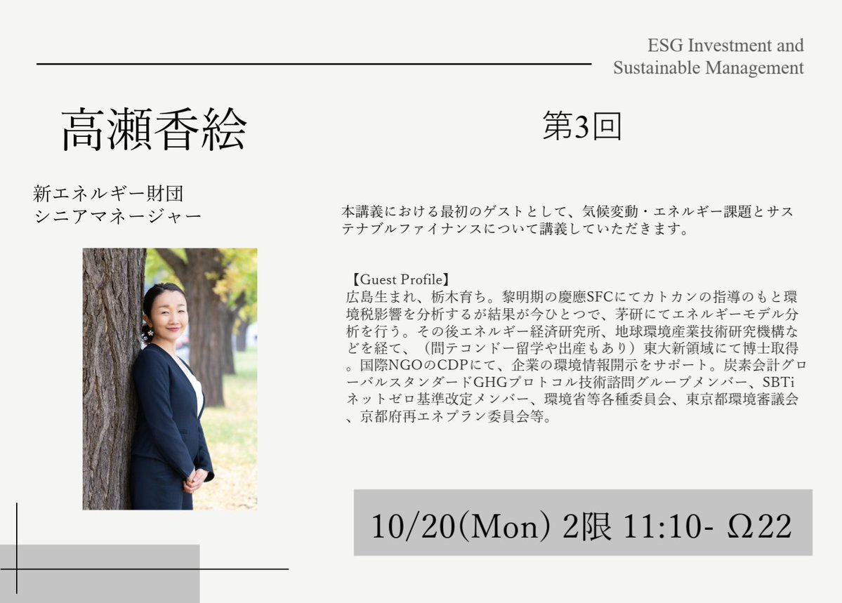 【ゲスト講義のお知らせ📢】 「ESG投資とサステナブル経営」のお知らせです! ✔️日時 10/20(月) 11:10~@ Ω22 新エネルギー財団シニアマネージャー 高瀬香絵氏 講義を履修してない方でも聴講可能です。申し込み不要なので直接教室までお越しください🏃