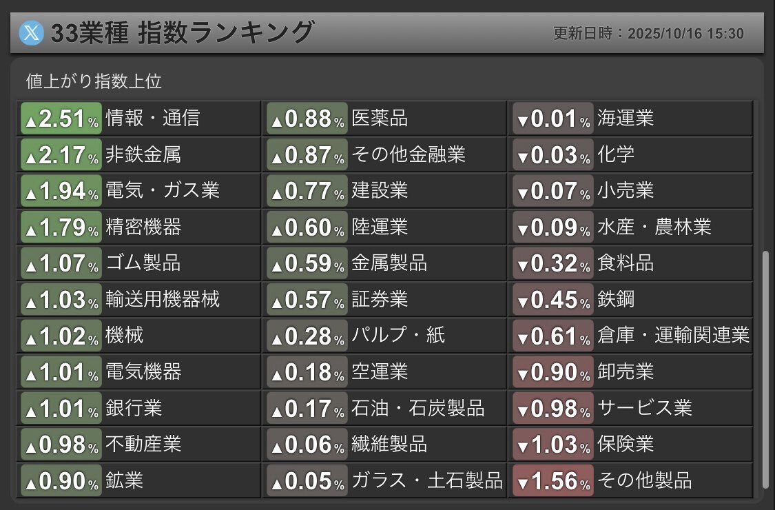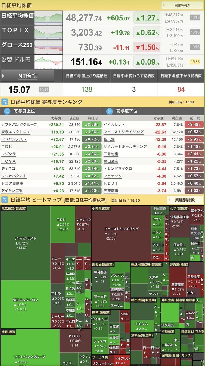 🚨 東京株式市場:後場|2025年10月16日(木) 16:30 JST 日経平均は続伸し、終値は前日比1.27%高の4万8277円74銭。自民党と日本維新の会の政策協議開始を受け、政局不透明感が後退。ソフトバンクGが急騰し指数を380円押し上げた。TOPIXとJPX400もそろって堅調。 📊 後場サマリー ・日経平均 $NIKKEI pic.x.com/hgPTxiE6qg x.com/aurra_jp/statu…