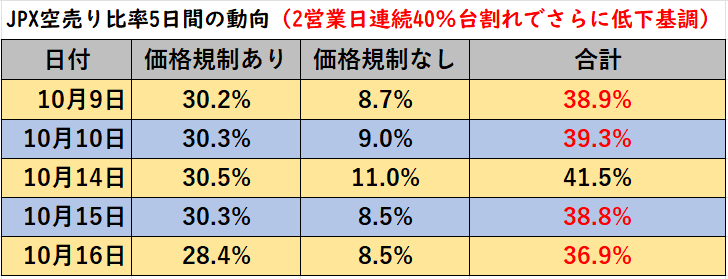 JPXが発表した16日の空売り比率。2営業日連続40%台割れで低下基調継続!空売り比率の分析方法のひとつとして、経験則からの分析があります。空売り比率が40%割れまたは50%超になると、その後、近日中に指数の調整的な値動きになることが、必ずではないですが多く発生することから注目。ご参考までに! pic.x.com/BFfurnzqpy