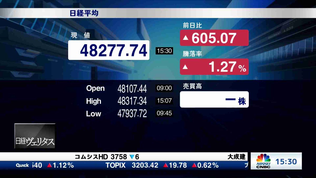 🔍【本日の市況ダイジェスト】 ▶︎日経平均+1.27%(+605円)→48,277円 ▶︎TOPIX+0.62%/JPX日経400+0.62% ▶︎情報通信+2.51%、非鉄金属+2.17%、精密機器+1.79% ▶︎グロース250のみ-1.50%で一服 #経済指標 #投資戦略 #マーケット pic.x.com/Z88coOL8kU