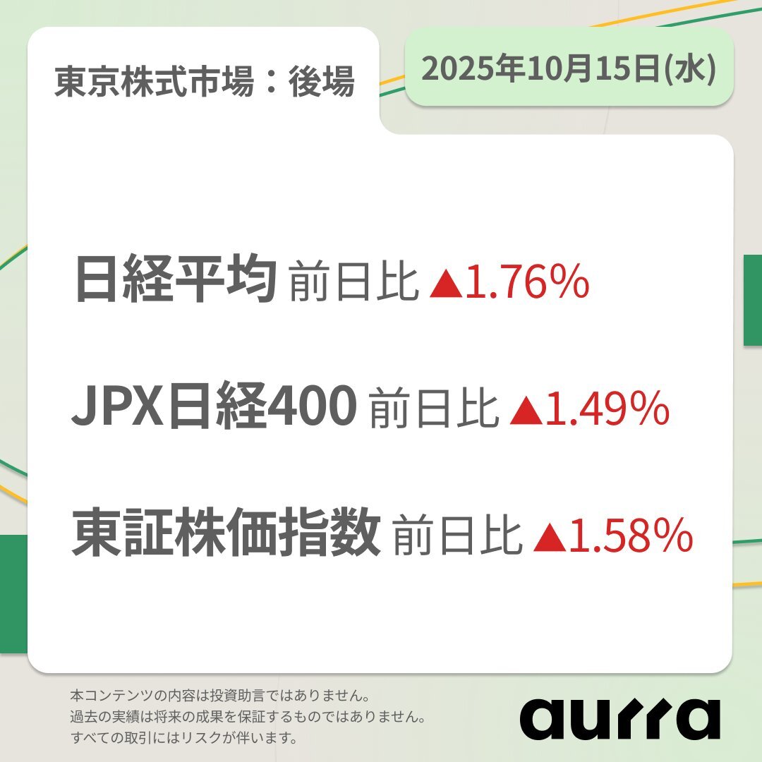 🚨 東京株式市場:後場|2025年10月15日(水) 17:15 JST 日経平均は3日ぶりに反発し、終値は前日比4万7672円67銭(1.76%)高。米利下げ期待とダウ上昇が支援し、半導体株を中心に幅広く買い戻し。TOPIXとJPX400も大幅高で取引を終えた。 📊 後場サマリー ・日経平均 $NIKKEI 前日比 ▲1.76% 前日 x.com/aurra_jp/statu…