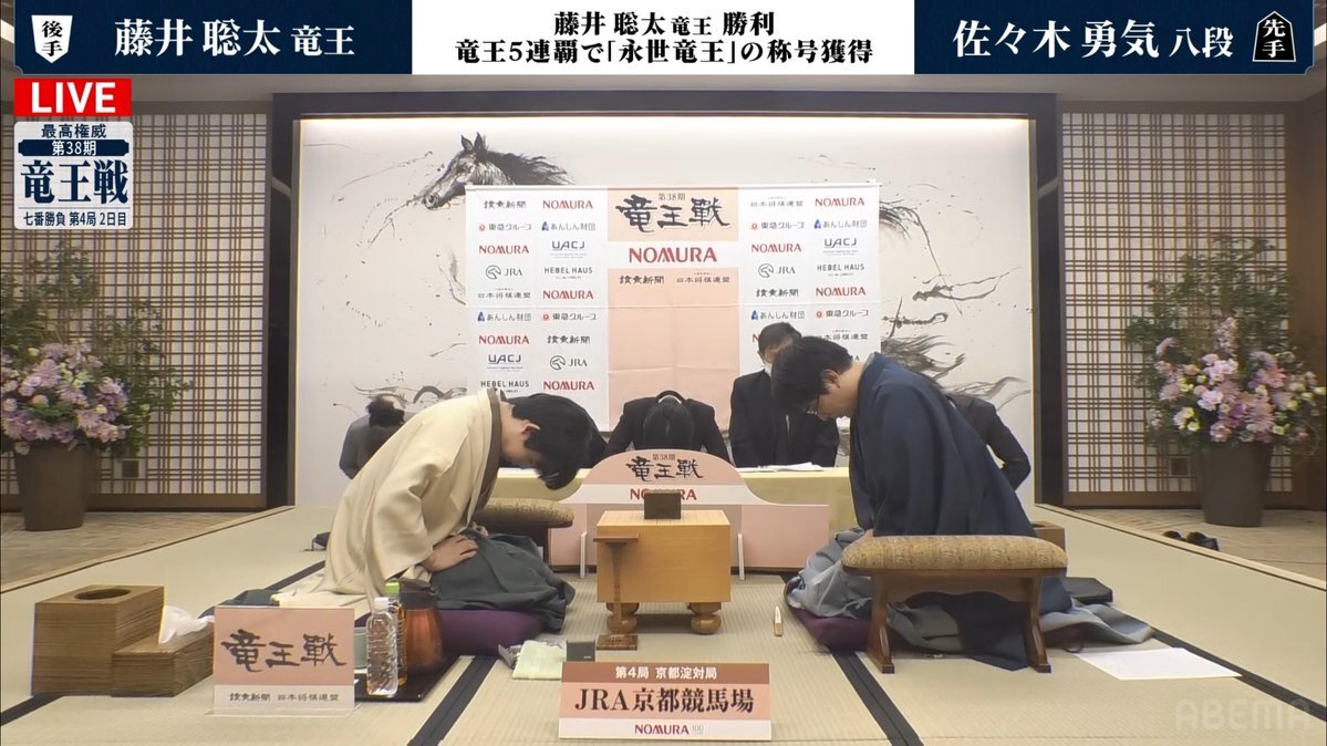 【第38期 #竜王戦 第4局2日目】 [☗#佐々木勇気 八段vs☖#藤井聡太竜王] 一礼して、新しい歴史を刻んだ七番勝負、これにて終了です 関係者・ファンのみなさま、お疲れ様でした 年内のタイトル戦はこれにて終了です [藤井4(防衛)0勇気] #将棋 #ABEMA #ShogiLive