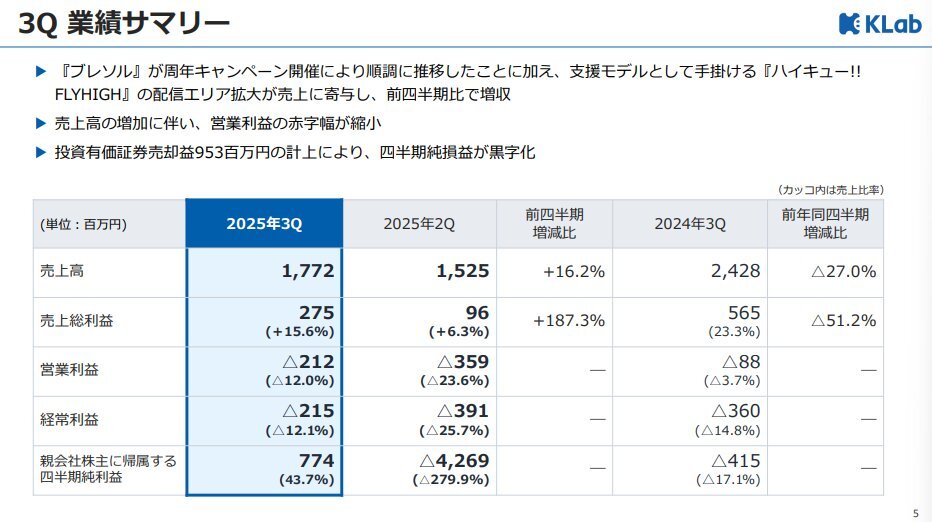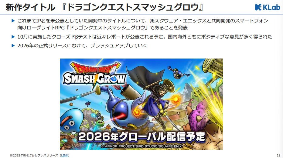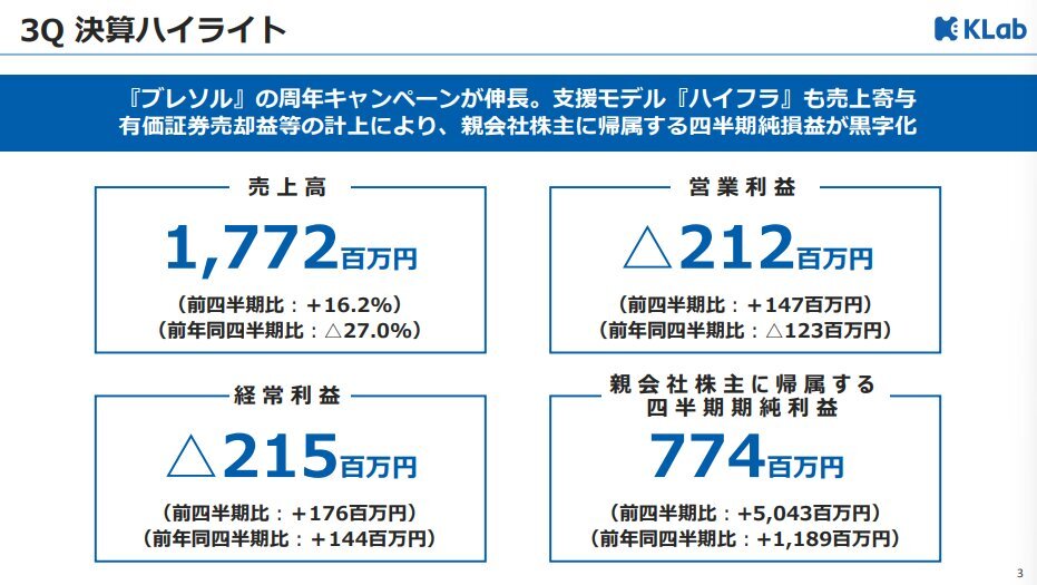 【3656 #KLab】3Q決算 #エンタメ決算 売上:49億3400万円(YoY▲18.6%) 営利:▲8億6000万円(前年▲11億1300万円) 企業: ソシャゲ開発・運営 今期: #ブレソル 好調も #たたかえドリームチーム 減速で減収。希望退職や拠点縮小でコスト削減進行。次期は #ドラクエスマグロ 期待 klab.com/jp/ir/library/ pic.x.com/oMBVLdAYWI