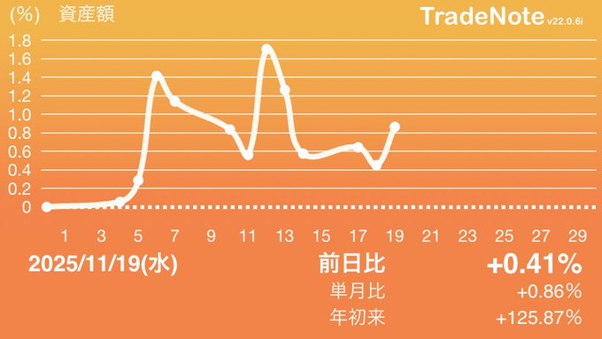 ✅ 今日の日経平均報告ツイート(11/19) 📈日経平均:48,537.70(-165.28 / -0.34%) 📊持ち株:+11,100円 🔺上昇 ・スターティア:+0.50% ・ライオン:+3.36% ・サンフロンティア:+0.56% ・楽天グループ:+0.69% 🔻下落 ・サイバーエージェント:-1.89 ・KLab:-2.60% 今日もおつかれさまです
