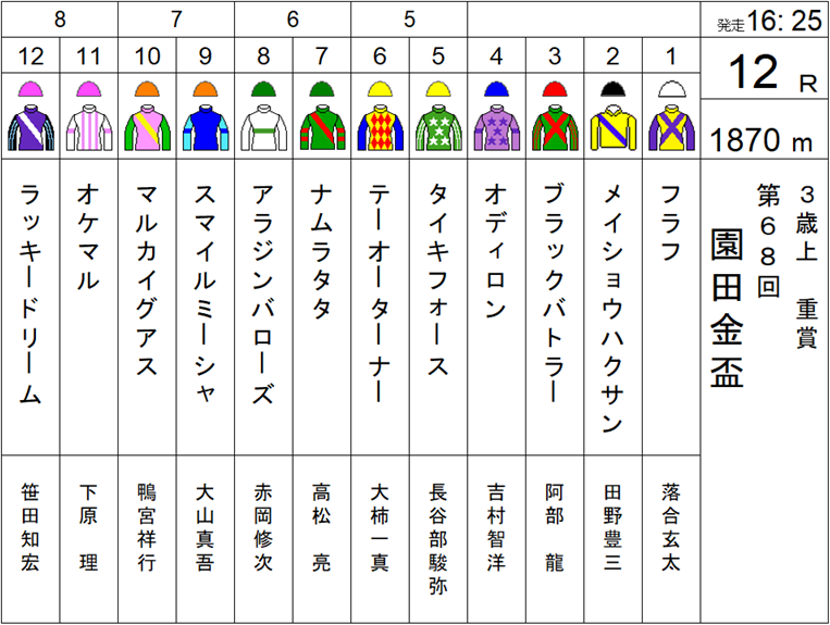 【園田金盃出馬表】 11/27(木) 12R、重賞「園田金盃」(園田1870m)の枠順が確定しました。 無敗の三冠馬でファン投票1位に輝いたオケマルは11番。連覇を狙うマルカイグアスは隣の10番。再び中距離に矛先を向けたダートグレードホースのアラジンバローズは8番。