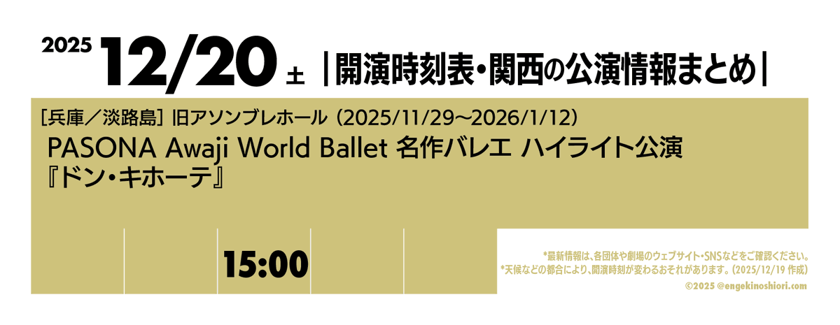 【12/20(土) 15:00-】 🎪[兵庫/淡路島]旧アソンブレホール(2025/11/29〜2026/1/12) 🎭️ PASONA Awaji World Ballet 名作バレエ ハイライト公演『ドン・キホーテ』 📡 awajiballet.com/don-quixote *天候などの都合により、開演時刻が変わるおそれがあります #開演時刻表 pic.x.com/FwNqavvm2Q
