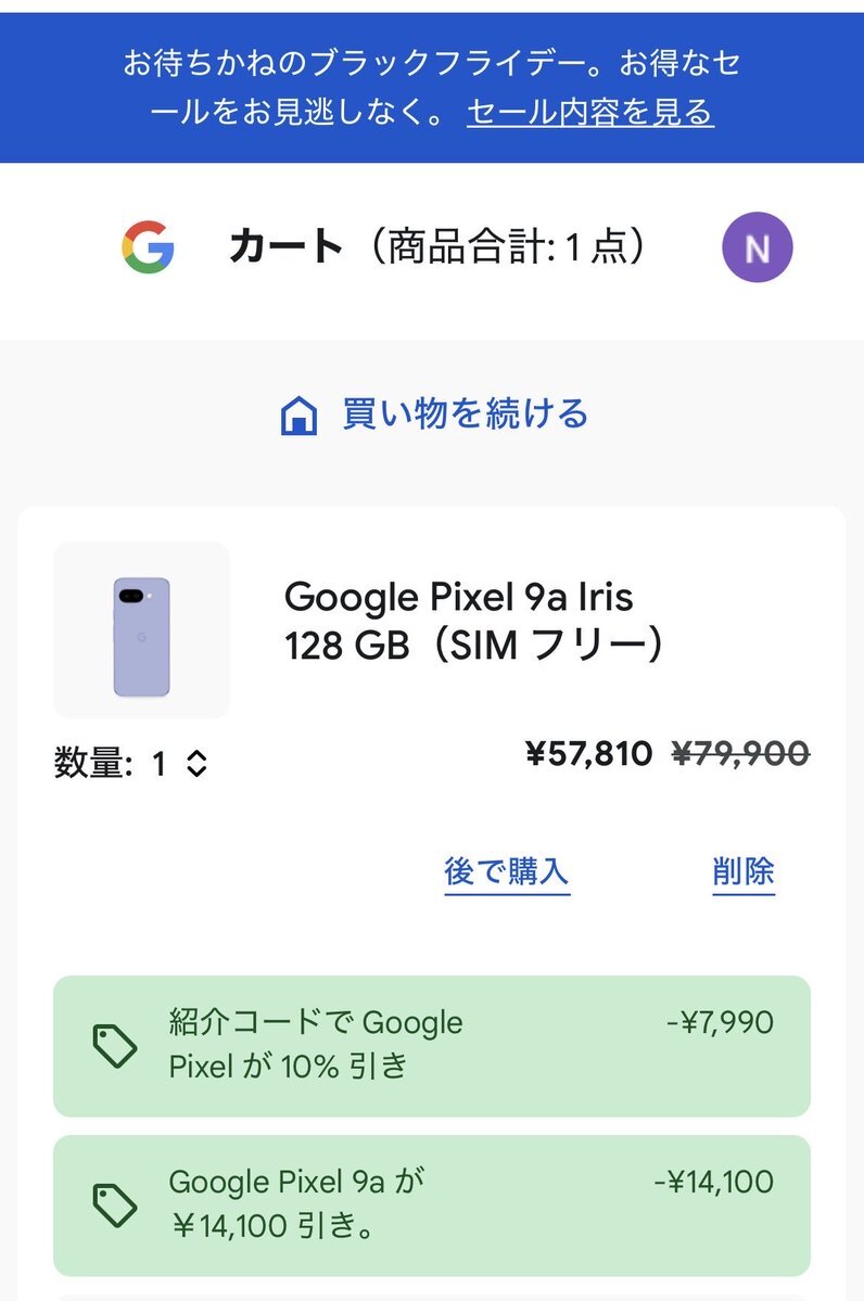 お、pixel9aちゃんのブラックフライデー、ストレートに値下げじゃん。