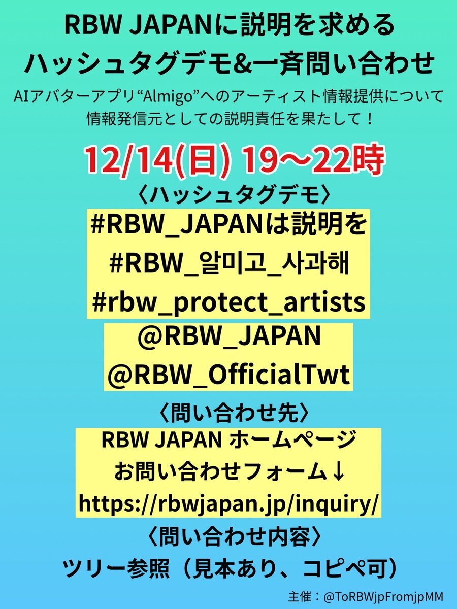 【一斉アクション告知】 有志声明の発表から6ヶ月目を迎える明日14日(日)、本件について未だ反応を示さないRBW JAPANに対し、ハッシュタグデモと一斉問い合わせを実施します。 詳細は画像をご覧ください。 #RBW_JAPANは説明を #RBW_알미고_사과해 #rbw_protect_artists pic.x.com/OxWGa3QTHR