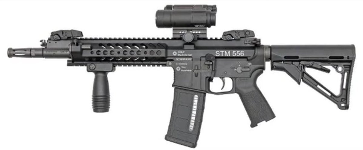 シュタイヤー・マンリッヒャーSTM556 アメリカ市場参入にあたり開発されたAR-15クローン。AUGと同じワンタッチでバレルの着脱が可能になっており、標準的な16インチをはじめ13インチ、11.5インチなど様々なタイプのバレルを選択できる。 pic.x.com/Qu5wmLTexH