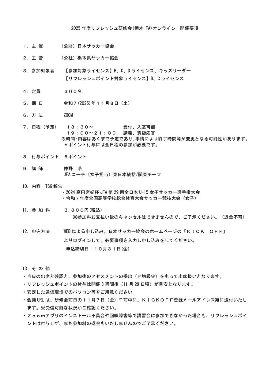 2025年度リフレッシュ研修会(栃木 FA)オンラインの開催について、HPに掲載しました。 tfa.or.jp/wptfa/?p=5154 #栃木県サッカー協会 #tochigifa #tfa #サッカー #指導者 #bライセンスコーチ #cライセンスコーチ #リフレッシュ講習会 pic.x.com/3bY28rJn2T