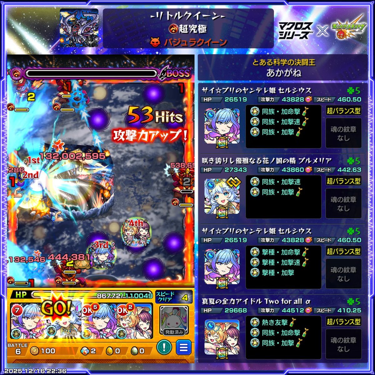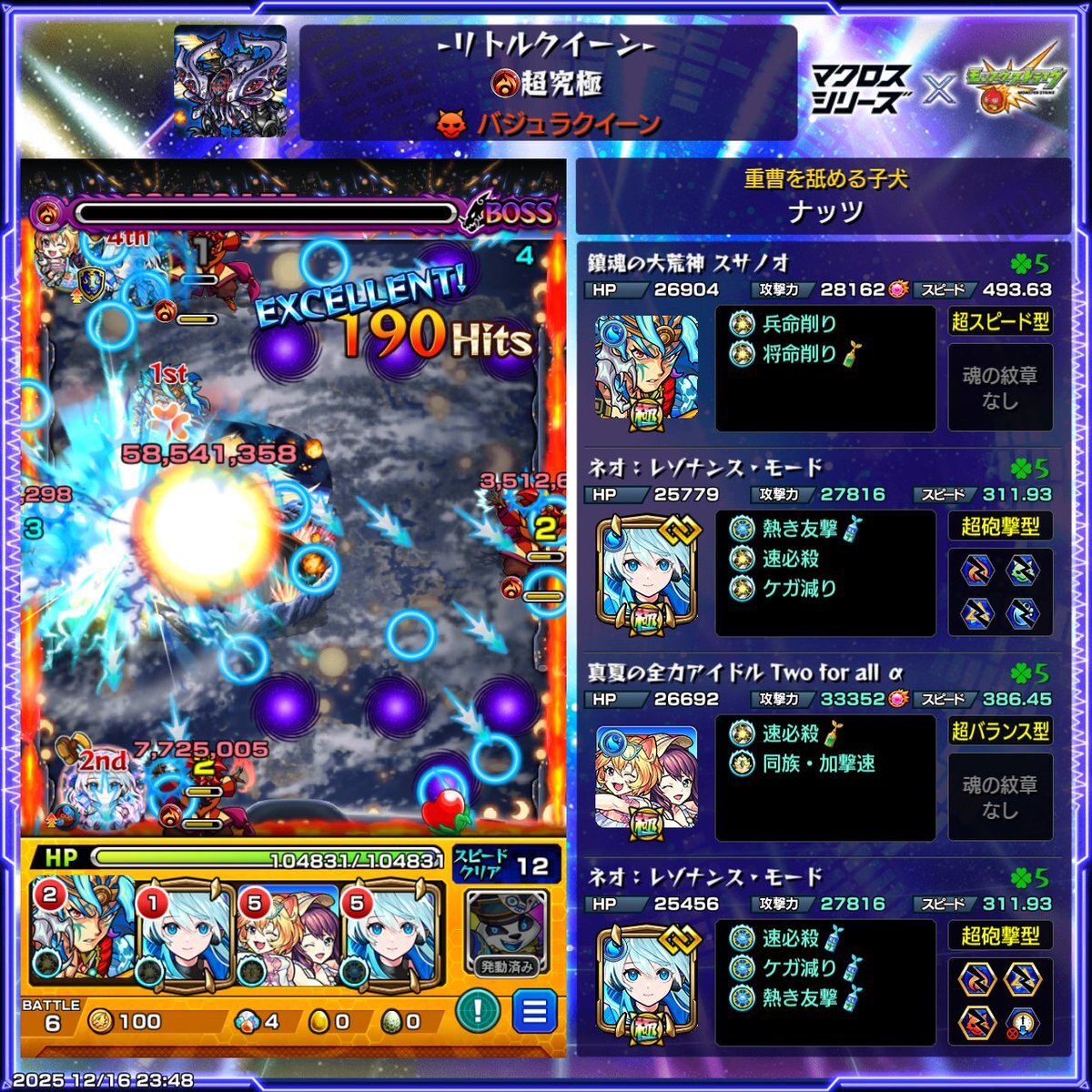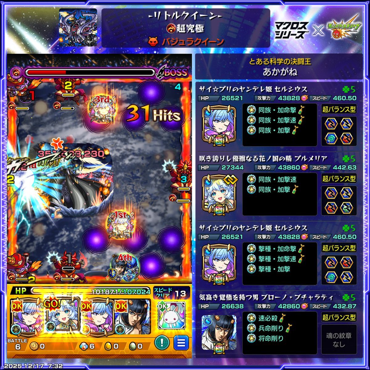 バジュラクイーン取り敢えず初見クリア分とガチガチに固めたやつ。歌の力前提クエなのに気付かず素で突っ込んだけど何とかなるものだな!なので紋章込みだと割と楽。 個人的にはモンスト側のアイドルのセルシウスとTFAが適正なのが綺麗な構成だと思いました。姫、ここぞでやってくれると信じてたぜ。 pic.x.com/QSufH6lKVL