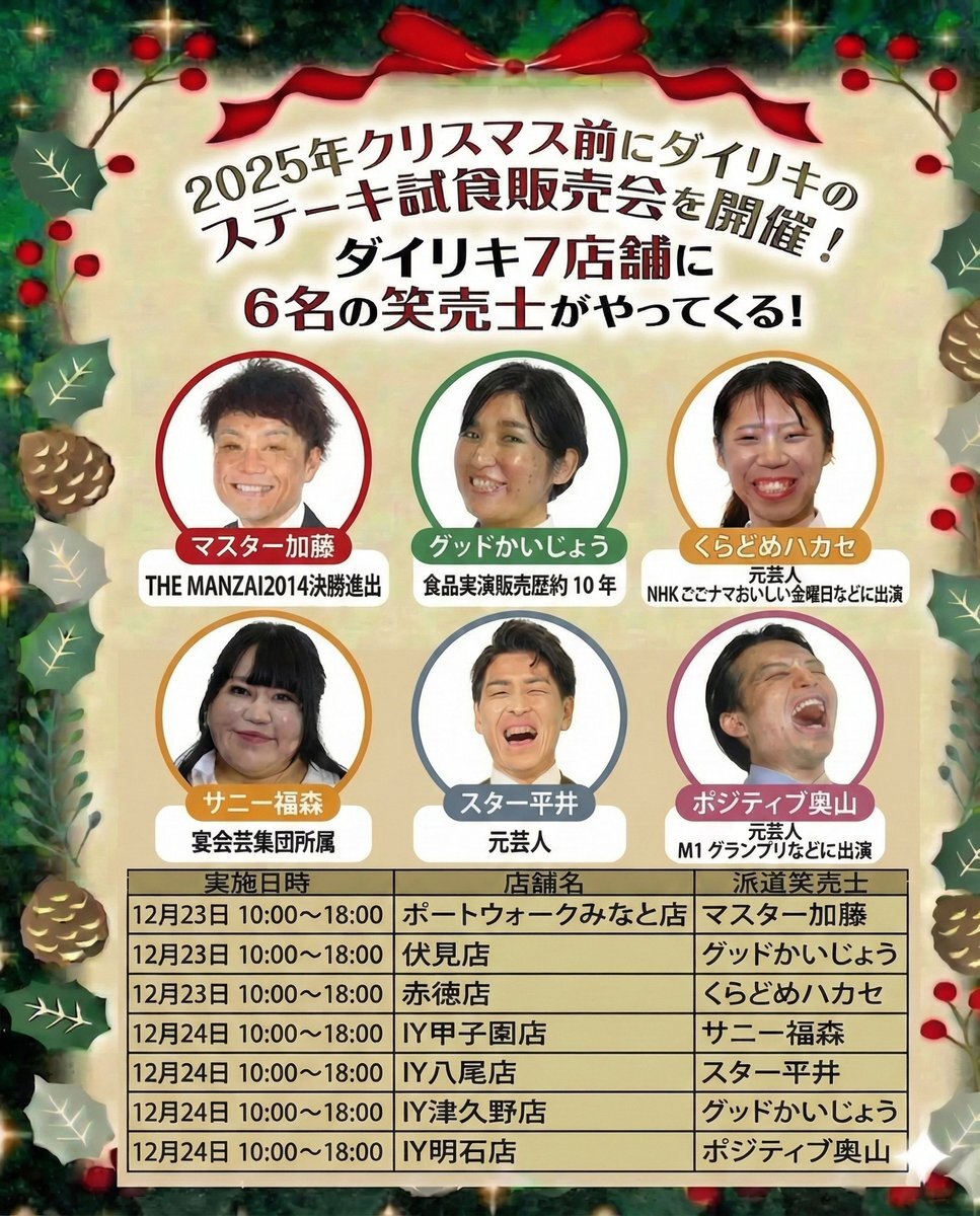 ダイリキに笑売士がやってくる🏃♀️ 12月23、24日にステーキの試食販売をおもしろくしてもらいます😃 例えば...マスター加藤は元芸人でTHE MANZAI2014決勝進出、爆笑オンエアバトル第9回チャンピオン⼤会出場など実績多数!🔥 詳しい内容、店舗、日程は画像を確認してください🍖 pic.x.com/TfjaDCn2Vy