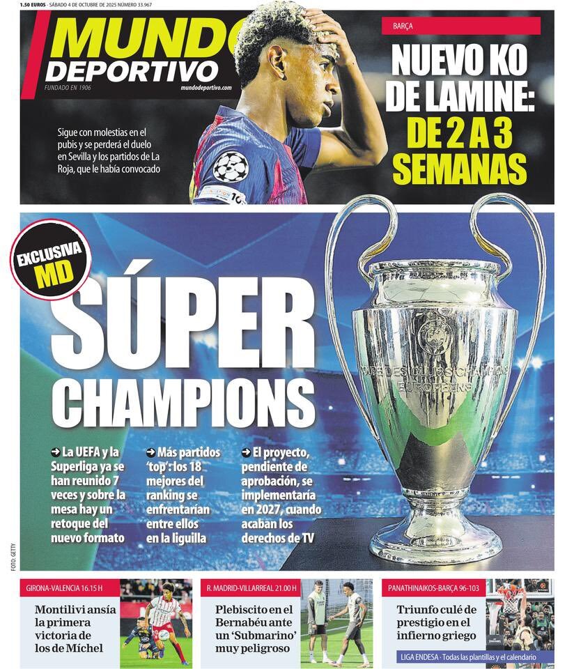"Súper Champions" 「スーペル・チャンピオンズ」 UEFAとスーペルリーガは既に7回会合を開き、新フォーマットの調整が検討されている 更なる"トップ'ゲーム:ランキング上位18チームがプレーオフで対戦することになる 承認待ちのプロジェクトはテレビ放映権が切れる2027年に実施される予定 #PortadaMD pic.x.com/lc9P79xN7B