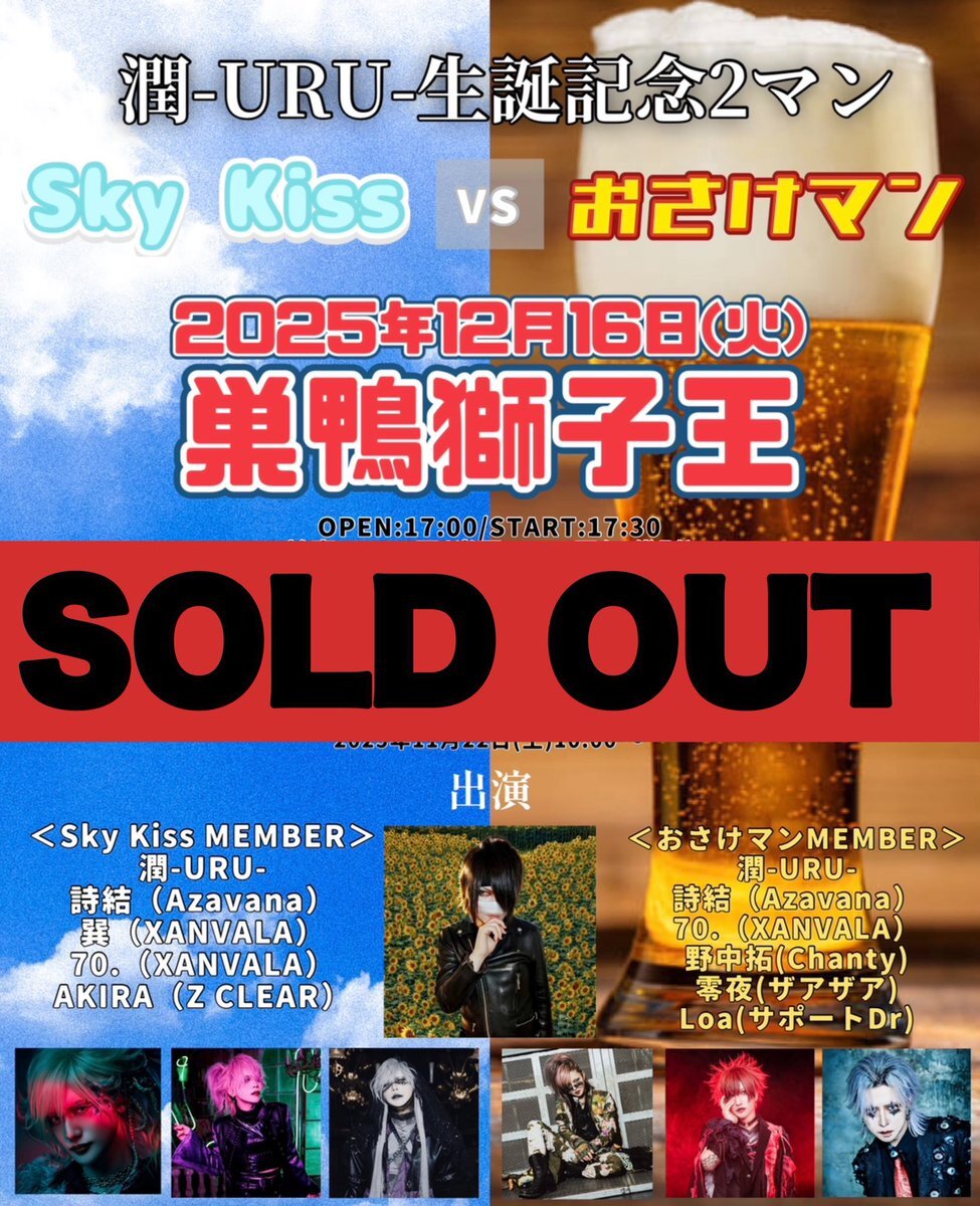 ◽️本日の公演◽️ 🔴完売御礼🔴 潤-URU-生誕記念2マン Sky Kiss VS おさけマン 【出演】Sky Kiss / おさけマン 【日程】2025年12月16日(火) 【会場】巣鴨獅子王 ※当日券の販売はございません pic.x.com/LBxXvwl6aJ