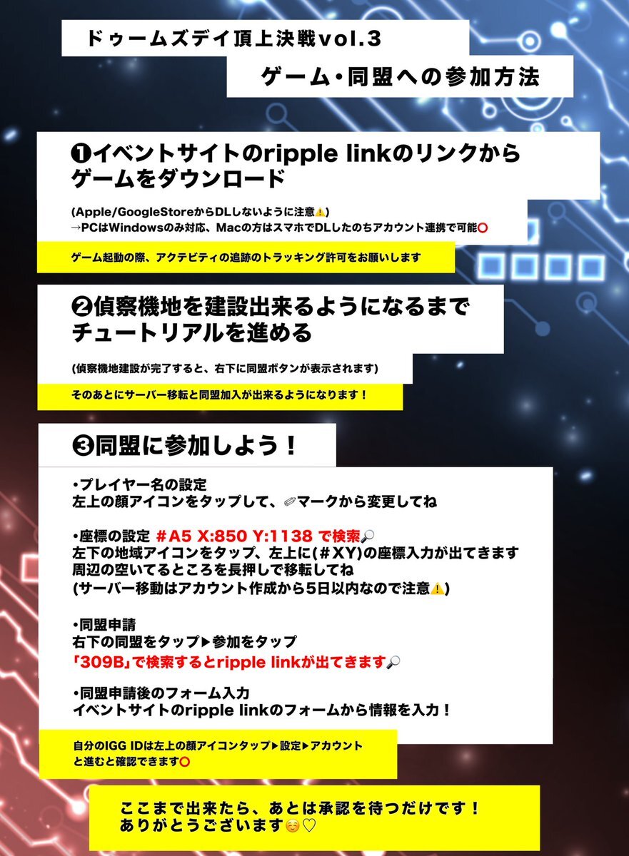 スタートダッシュを一緒にキメてプレイしてくれている皆さまアリガトッ🥺♡ ドゥームズデイを始めるにあたり、よくわかんないよ~という方へ画像で要点をまとめてみました😊 まだまだ足りない😭‼️ ぜひ一緒にプレイして欲しいです…! ▼公式サイトはこちら event.igg.com/celebrity?code… #PR x.com/ripple_link/st…