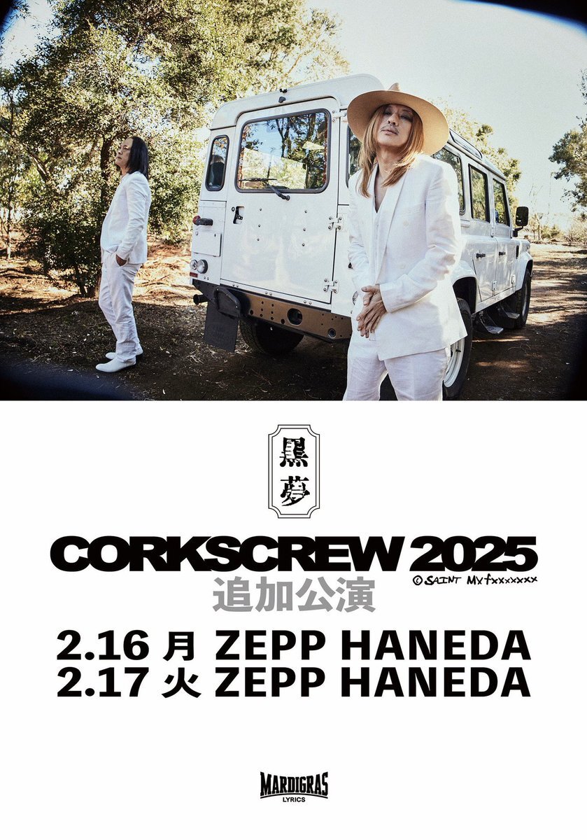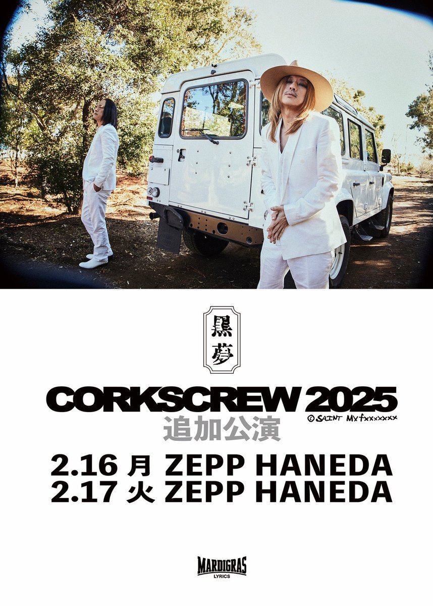 黒夢 CORKSCREW 2025 追加公演 ZEPP TOUR ADDITIONAL SHOW 2.16 (月) Zepp HANEDA 2.17 (火) Zepp HANEDA @diskgarage_web pic.x.com/ZJIBEAfijK