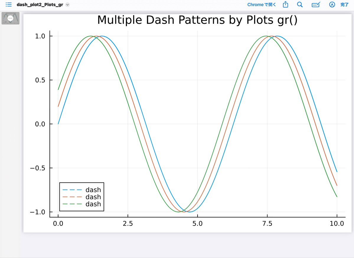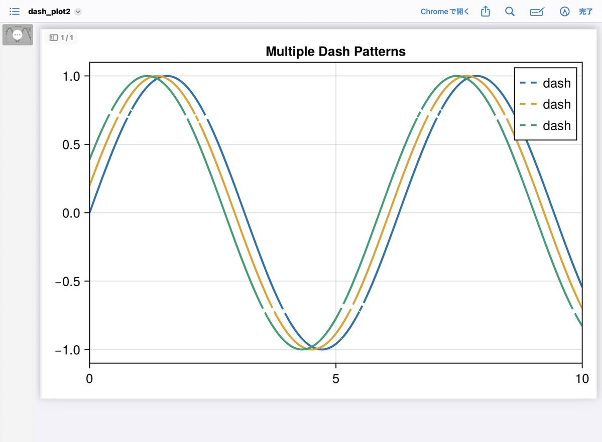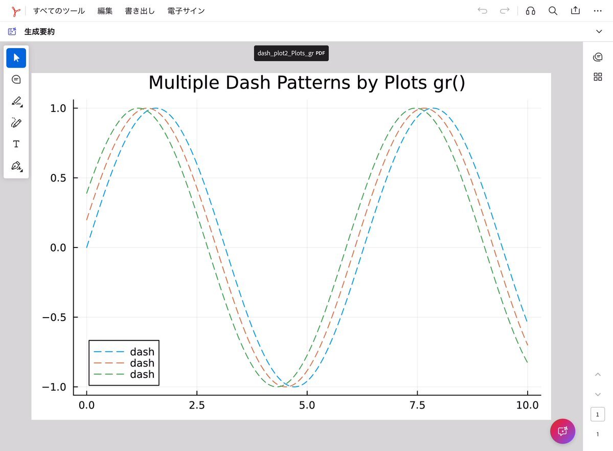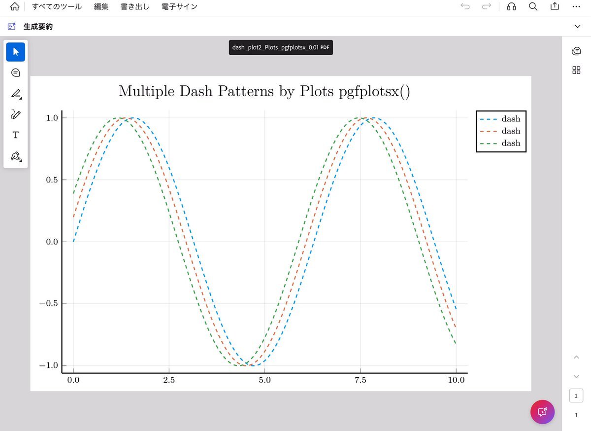#Julia言語 環境: iPadOS 16.7.12 (20H364) 古くてすみません。 Plots.jl gr()で作った dash_plot2_gr.pdf 添付画像① Adobe Acrobat Readerでは正常に表示 添付画像② ファイルアプリで表示するとおかしくなる pic.x.com/GPi4rrkbFH
