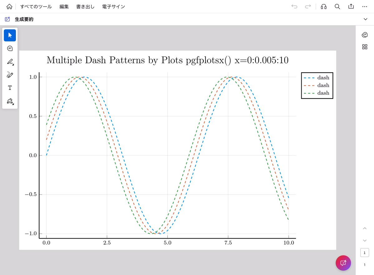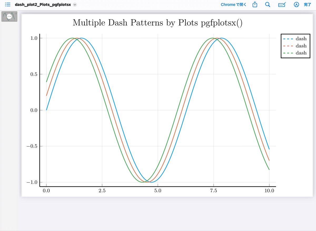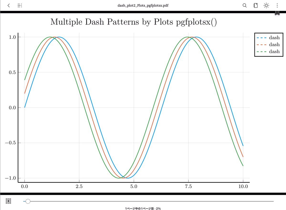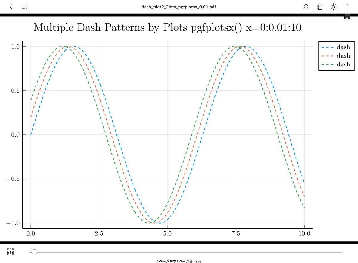 #Julia言語 Adobe Acrobat Readerなら正常に表示される。 環境: iPadOS 16.7.12 (20H364) (古い)でAdobe Acrobat Readerで表示 Plots.jl pgfplotsx()で作ったdash_plot2_Plots_pgfplotsx_{0.01, 0.005, 0.001}.pdf 添付画像 ①x=0:0.01:10 ②x=0:0.005:10 ③x=0:0.001:10 pic.x.com/dgTBFN0pTk