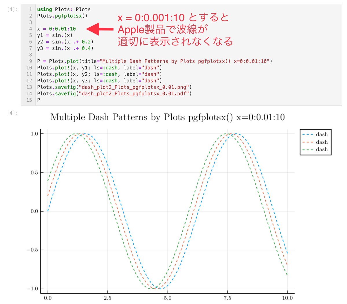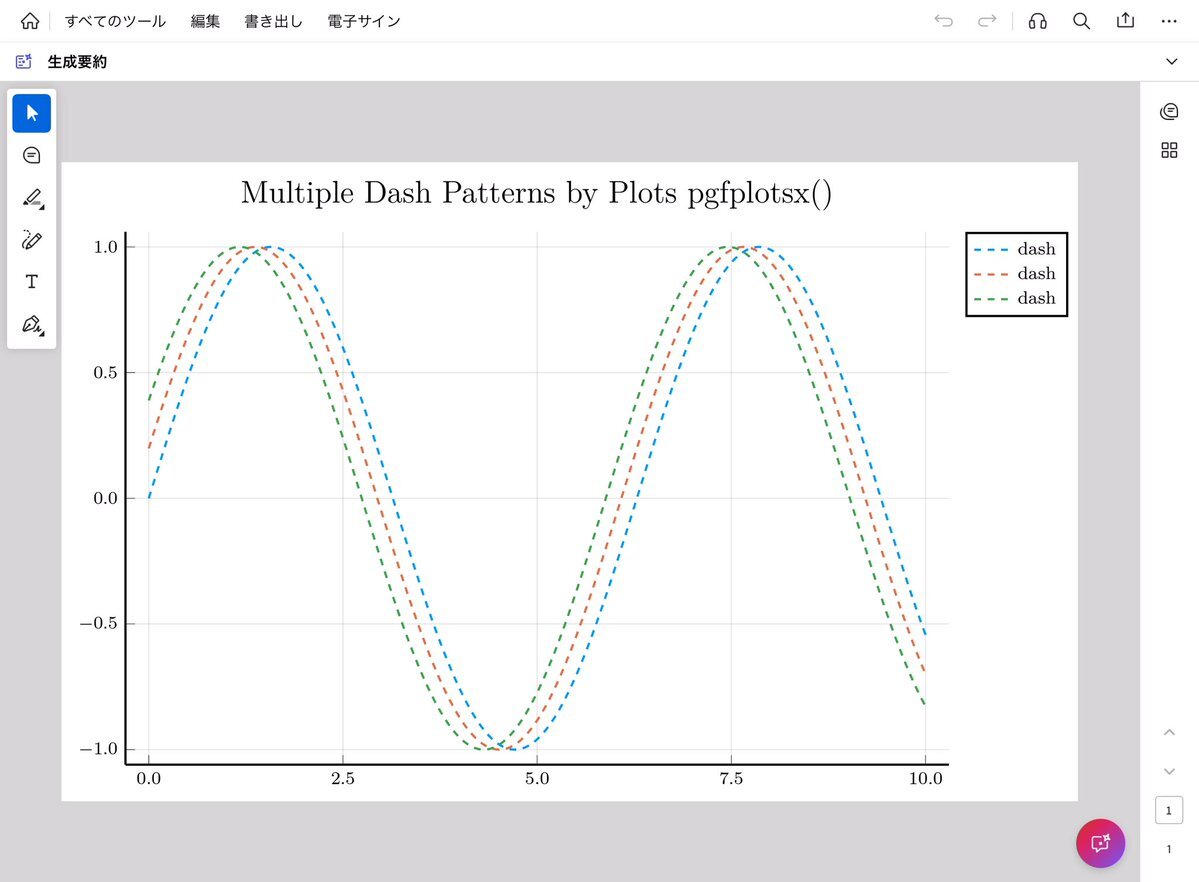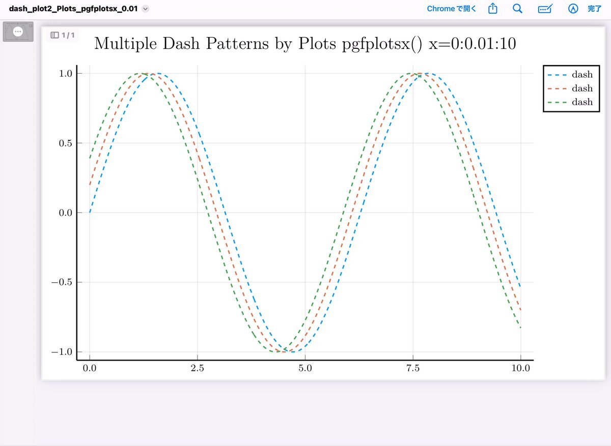 #Julia言語 Adobe Acrobat Readerなら正常に表示される。 環境: iPadOS 16.7.12 (20H364) (古い)でAdobe Acrobat Readerで表示 Plots.jl pgfplotsx()で作ったdash_plot2_Plots_pgfplotsx_{0.01, 0.005, 0.001}.pdf 添付画像 ①x=0:0.01:10 ②x=0:0.005:10 ③x=0:0.001:10 pic.x.com/dgTBFN0pTk