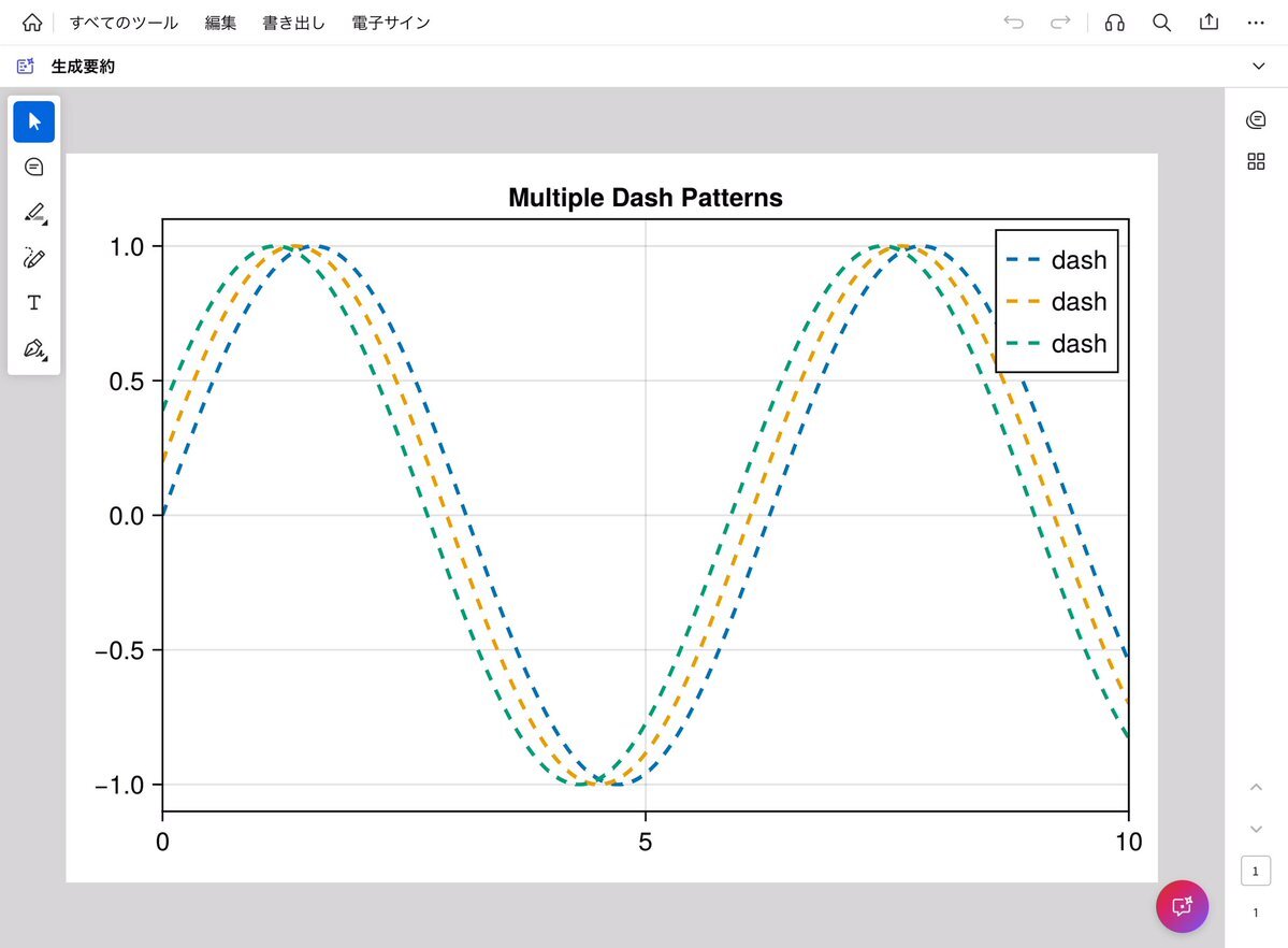 #Julia言語 環境: iPadOS 16.7.12 (20H364) 古くてすみません。 CairoMakie.jl で作った dash_plot2.pdf 添付画像① Adobe Acrobat Readerでは正常に表示 添付画像② ファイルアプリで表示するとおかしくなる pic.x.com/n68GlPvNIo